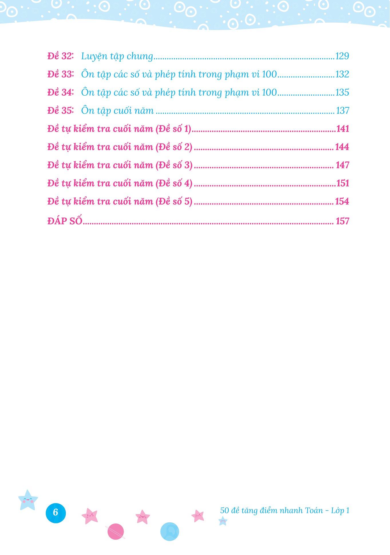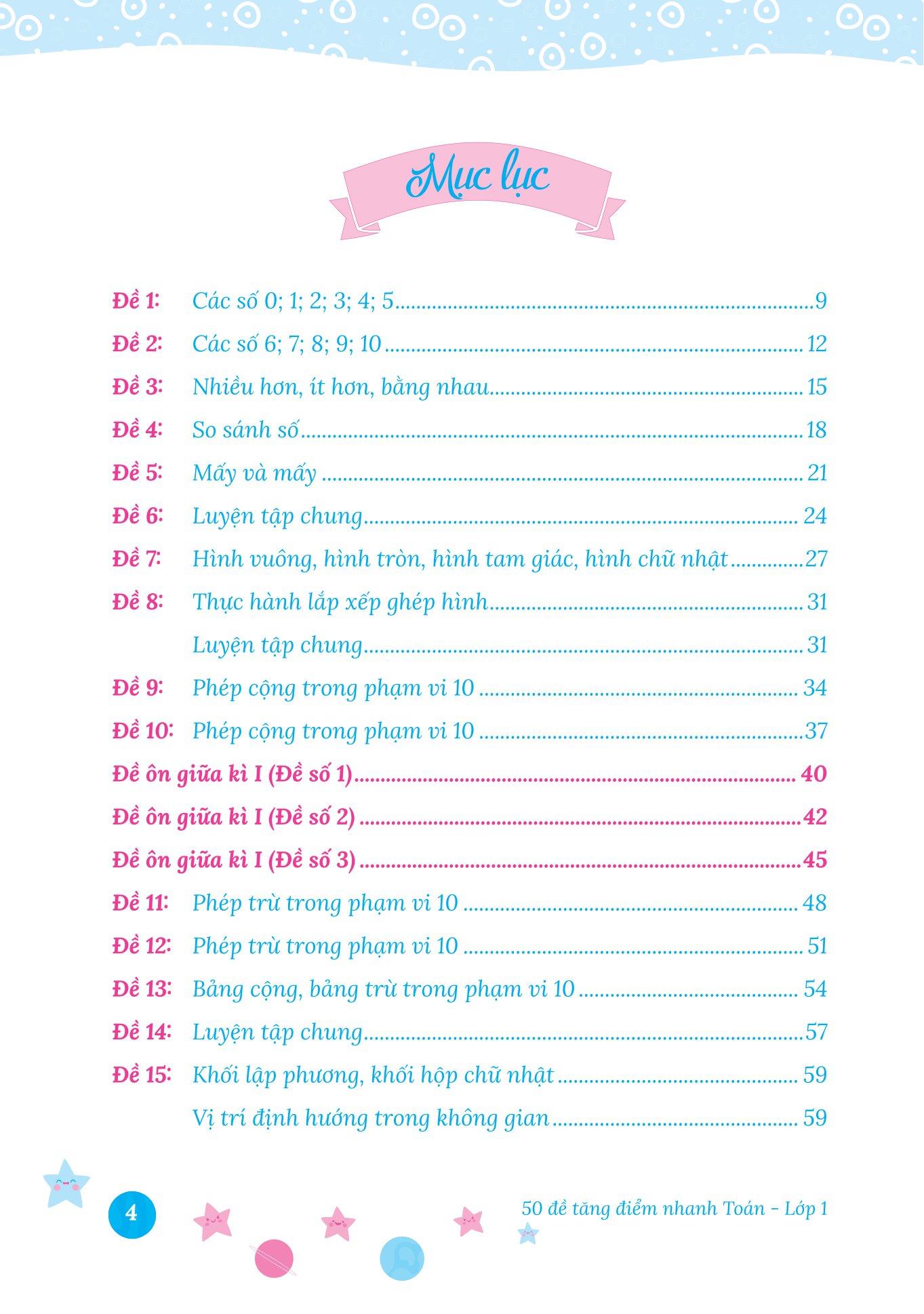Để giúp các em củng cố kiến thức và tự tin vượt qua những bài thi môn Toán, chúng tôi hân hạnh giới thiệu đến quý phụ huynh và các em học sinh cuốn sách “50 Đề Tăng Điểm Nhanh Toán Lớp 1”.