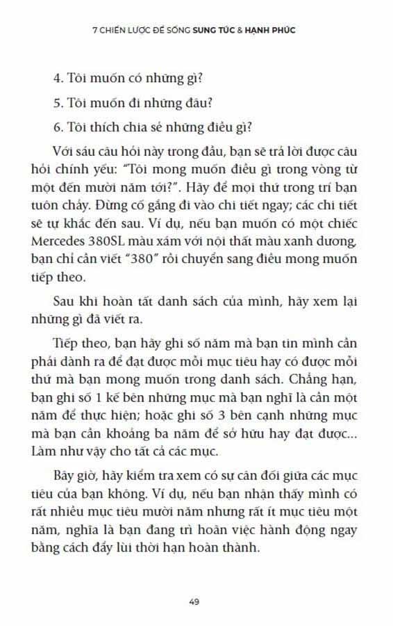 Đọc qua 11 chương sách, bạn sẽ khám phá 7 chiến lược nền tảng và thiết yếu mà qua đó, bất cứ ai cũng có thể nhận ra những triết lý sâu sắc, những điều bản thân còn thiếu sót, và những điều có thể áp dụng để xây dựng một cuộc sống sung túc và hạnh phúc. Đó là các chiến lược: Giải phóng sức mạnh của mục tiêu - Tìm kiếm tri thức - Sự thần kỳ của việc phát triển bản thân - Làm thế nào để đạt được tự do tài chính - Làm chủ thời gian - Kết giao với những người thành đạt - Học nghệ thuật sống tốt