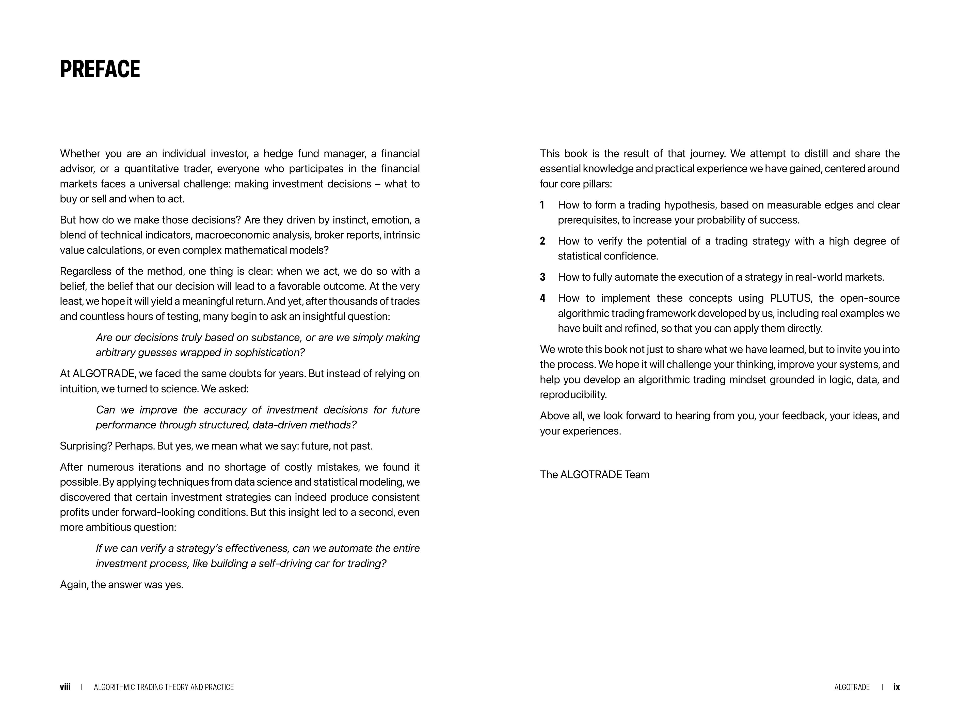 We wrote this book not just to share what we have learned, but to invite you into the process. We hope it will challenge your thinking, improve your systems, and help you develop an algorithmic trading mindset grounded in logic, data, and reproducibility.