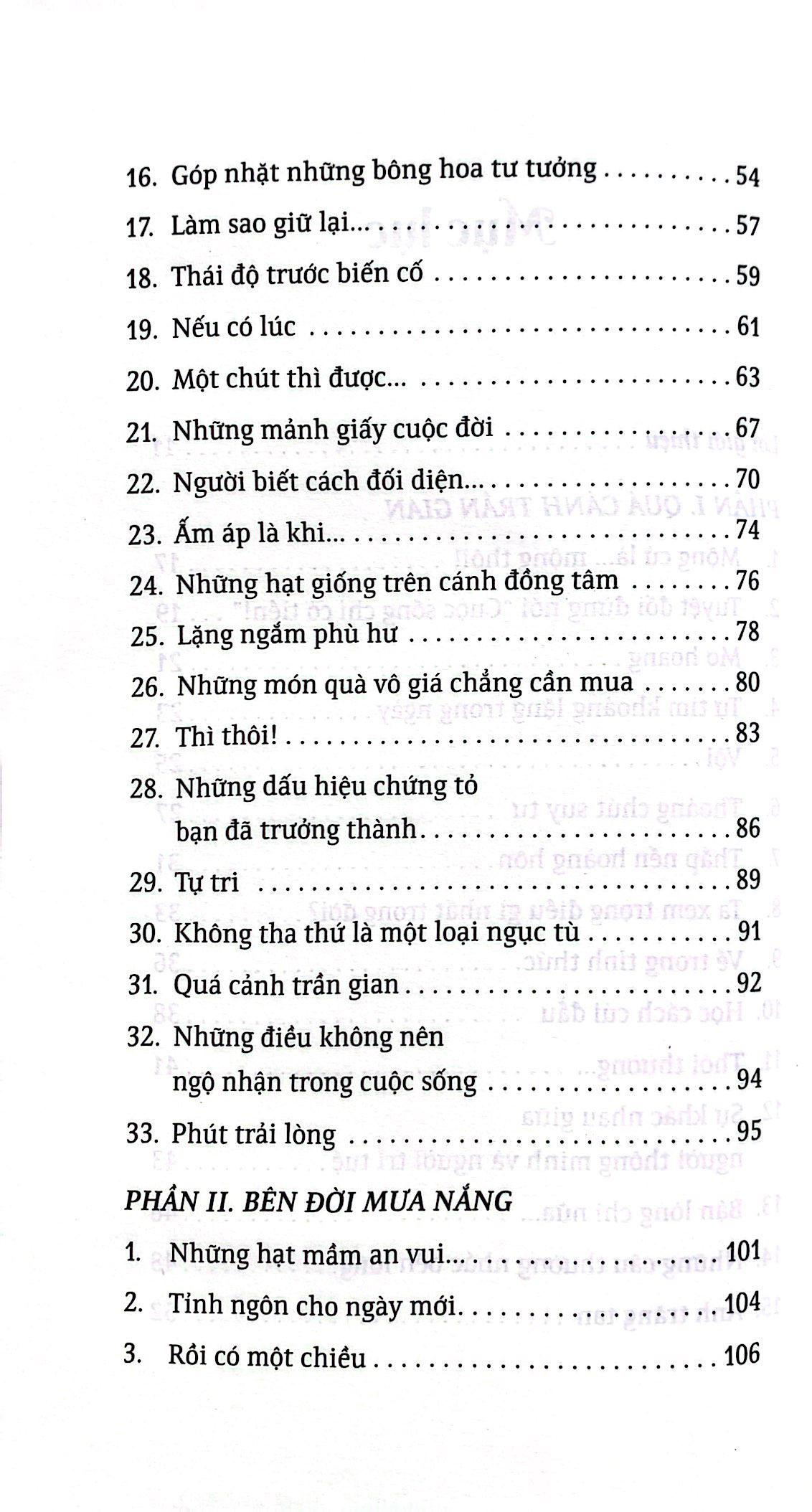 Những bài văn mang đậm chất triết lý, chất chứa các bài học trị liệu nỗi khổ niềm đau của kiếp sống con người: “Khi đến với cuộc đời này, ta chẳng mang theo thứ gì, khi rời đi, ta chỉ như một làn khói. Ngẫm lại đời người thật đơn giản vậy! Vinh hoa phú quý rồi cũng thoáng qua theo ngày tháng, ân ái tình thù rồi cũng trở về với cát bụi”.