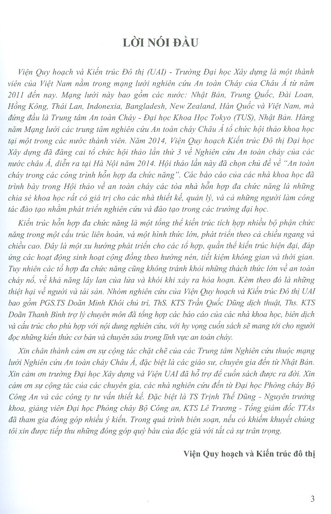 An Toàn Cháy Trong Kiến Trúc Hỗn Hợp Đa Chức Năng Kiến trúc cao tầng và Kiến trúc hỗn hợp đa chức năng là các loại hình kiến trúc phát triển trong thế giới đương đại. Hai cuốn sách “An toàn cháy trong kiến trúc hỗn hợp đa chức năng” và “An toàn cháy trong kiến trúc cao tầng và siêu cao tầng ở Việt Nam” sẽ mang đến cho người đọc cái nhìn khoa học về công tác tư vấn thiết kế, nghiên cứu và đào tạo.   Các thế hệ kiến trúc Nhà cao tầng đã liên tục cải thiện chất lượng kiến trúc, không gian sử dụng, đem tới cho con người sự tiện nghi và những ưu điểm không thể chối cãi trong xu hướng phát triển đô thị hiện nay. Với không gian tập trung phát triển theo chiều thẳng đứng, kiến trúc cao tầng không chỉ tiết kiệm đất đai, mà còn tiết kiệm cả việc đầu tư cơ sở hạ tầng, không chỉ tiết kiệm không gian mà cả thời gian. Kiến trúc hỗn hợp đa chức năng là một tổng thể kiến trúc tích hợp nhiều bộ phận chức năng trong một cấu trúc liên hoàn, và một hình thức lớn, phát triển theo cả chiều ngang và chiều cao. Đây là một xu hướng phát triển cho các tổ hợp, quần thể kiến trúc hiện đại, đáp ứng các hoạt động sinh hoạt cộng đồng theo hướng nén, tiết kiệm không gian và thời gian. Ngày nay, cả kiến trúc cao tầng và kiến trúc hỗn hợp đa chức năng đều phải đối mặt với sự đảm bảo về an toàn cháy. Đặc biệt, với những thách thức của biến đổi khí hậu toàn cầu thì những rủi ro của thiên tai, những trận động đất mà không ai ngờ tới có thể xuất hiện nhiều hơn. Việc thiết kế các tòa nhà cao tầng và tổ hợp kiến trúc đa chức năng cần phải đảm bảo an toàn sinh mạng cho con người khi xảy ra hỏa hoạn,  giúp người dân di chuyển nhanh nhất ra khỏi khu vực nguy hiểm, đảm bảo để các bộ phận cứu hộ, cứu hỏa có thể tiếp cận tốt nhất tới khu vực hỏa hoạn, đồng thời chống lan truyền lửa và khói sang các khu vực lân cận. Cuốn sách “An toàn cháy trong kiến trúc hỗn hợp đa chức năng” được Viện UAI biên tập dựa trên các báo cáo khoa học của các nhà khoa học tham gia hội thảo làn thứ 3 về Nghiên cứu An toàn cháy của các nước châu Á, diễn ra tại Hà nội năm 2014. Trong khi đó cuốn sách “An toàn cháy trong kiến trúc cao tầng và siêu cao tầng ở Việt Nam” được xây dựng trên cơ sở Chương trình khoa học và công nghệ cấp Bộ “Thiết kế và thi công nhà siêu cao tầng ở Việt nam” của Đại học Xây dựng do PGS.TS Doãn Minh Khôi là chủ nhiệm đề tài nhánh “An toàn sinh mạng trong kiến trúc siêu cao tầng ở Việt Nam”. Cả hai cuốn sách này đều là những tài liệu khoa học có ý nghĩa quan trọng trong công tác tư vấn thiết kế, nghiên cứu và đào tạo tại các trường đào tạo KTS và KSXD. Hy vọng chúng sẽ mang tới cho người đọc những kiến thức cơ bản và chuyên sâu trong lĩnh vực an toàn cháy- điều mà tất cả chúng ta đều quan tâm.