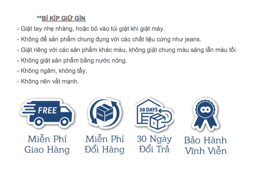 • Giặt tay nhẹ nhàng, hoặc bỏ vào túi giặt khi giặt máy.