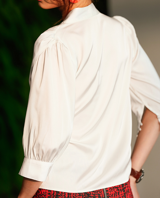 Tay nhún vai, dài qua khuỷ tay, cài bẳng 3 nút khuy dây