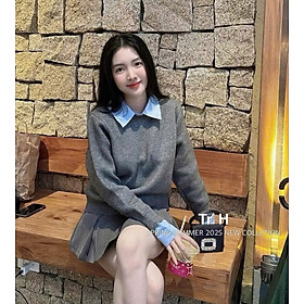 Áo Len Xám Mix Cổ Sơ Mi Xanh – item thời trang trẻ trung, dễ phối đồ Thiết kế: Áo len xám basic, điểm nhấn cổ sơ mi xanh nổi bật, mang đến phong