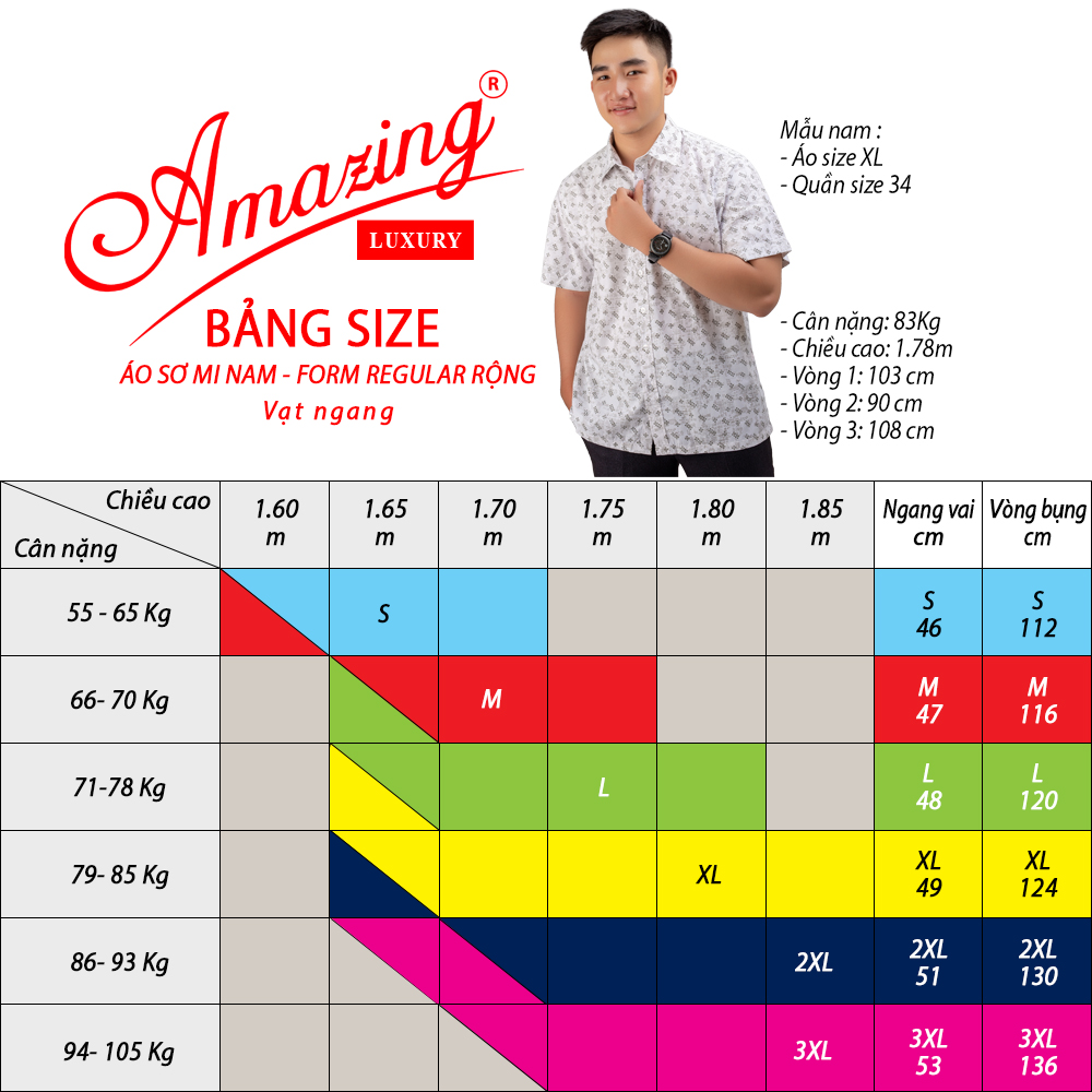 - HƯỚNG DẪN CHỌN SIZE ÁO SƠ MI NAM HỌA TIẾT: Bạn xem bảng quy đổi (thông số thành phẩm áo) để chọn size phù hợp, nếu còn phân vân, xin vui lòng inbox, Shop sẽ tư vấn tận tình. Các chỉ số trong bảng thông số không tuyệt đối chính xác, giao động trong khoảng +-2cm, số cân nặng chỉ là khoảng ước chừng, đúng với số đông, chứ không đúng trong mọi trường hợp Nếu bạn không cao hoặc có vòng bụng lớn, bạn chọn tăng size lên cho vừa bụng, đặc tính mã hàng này là mặc rộng rãi
