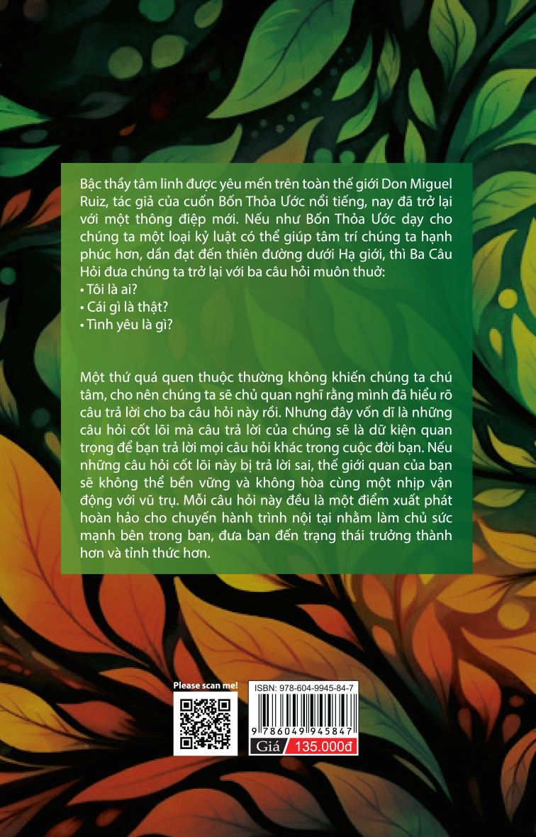 Bậc thầy tâm linh được yêu mến trên toàn thế giới Don Miguel Ruiz là tác giả của cuốn Bốn thỏa ước nổi tiếng nay đã trở lại với một thông điệp mới. Nếu như Bốn thỏa ước dạy cho chúng ta một loạt kỷ luật có thể giúp tâm trí chúng ta hạnh phúc hơn, dần đạt đến thiên đường dưới hạ giới thì Ba câu hỏi sẽ đưa chúng ta trở lại với các câu hỏi muôn thuở: Tôi là ai? Cái gì là thật? Tình yêu là gì?