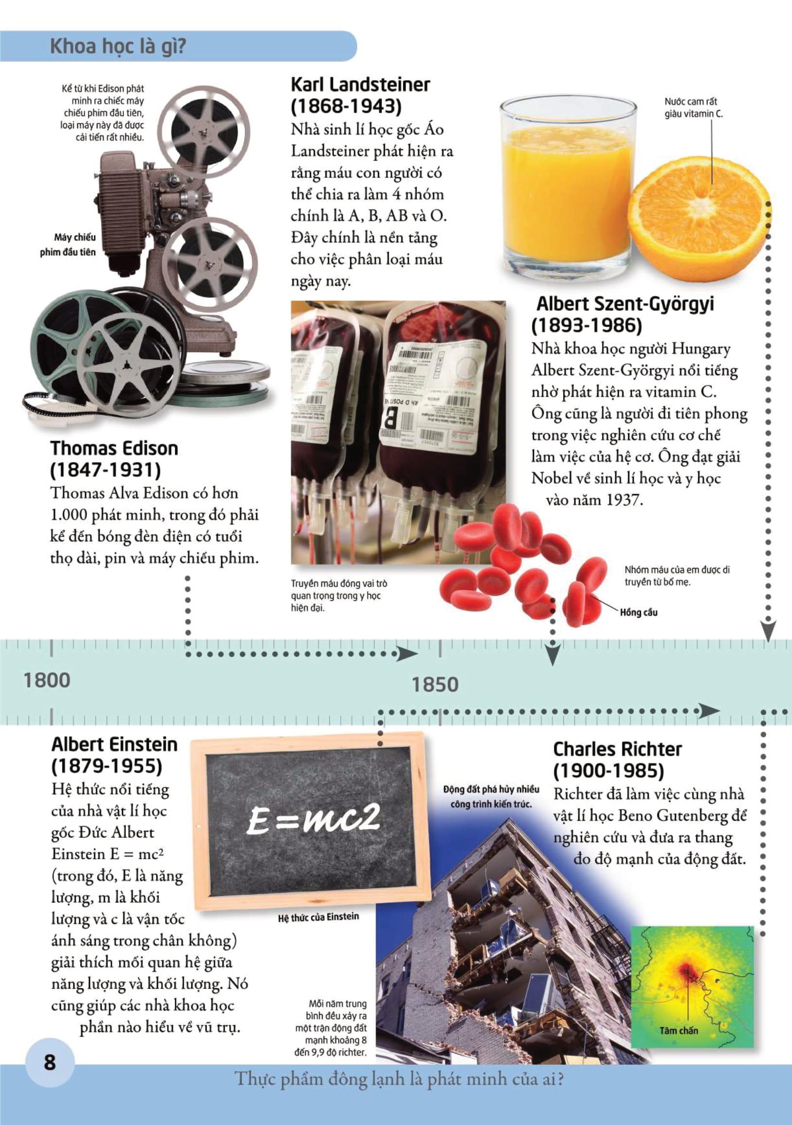 Với các hình minh họa trực quan sinh động, bắt mắt, cuốn sách cung cấp một lượng kiến thức phong phú, súc tích, dễ hiểu, cùng những câu hỏi vui, mẩu thông tin thú vị về khoa học. Em sẽ được tìm hiểu từng lĩnh vực mà khoa học nghiên cứu, từ sinh vật học, hóa học, vật lí tới thiên văn học. Bên cạnh đó, em có thể tìm trong cuốn sách các hướng dẫn và gợi ý giúp em thử làm nhà khoa học nhí nữa đấy.