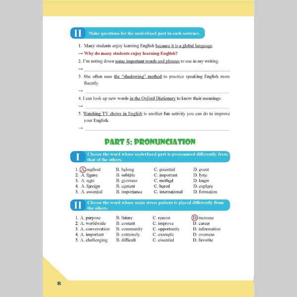 Sách được bố cục theo từng đơn vị bài học, tương ứng với từng Unit trong sách giáo khoa Tiếng Anh 8. Mỗi đơn vị bài học gồm: Từ vựng (Vocabulary): tổng hợp tất cả