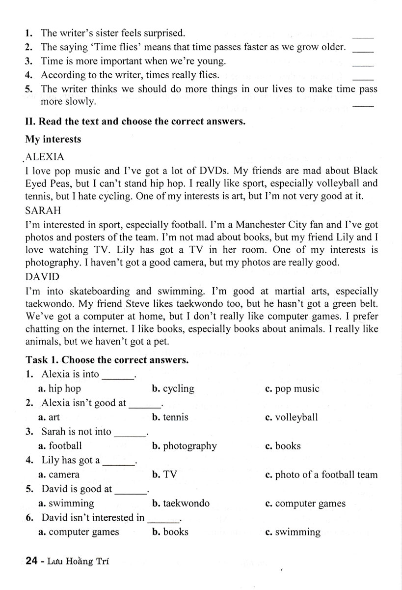Bài Tập Tiếng Anh 7 - Không Đáp Án (Bám Sát SGK Chân Trời) gồm một bài ôn tập củng cố kiến thức đã học (Starter Unit), và 8 đơn vị bài học chính: My time, Communication, The past, In the picture, Achieve, Survival, Music, I believe I can fly và sau mõi đơn vị bài học đều có bài ôn tập Review, Bài tập dành cho mỗi đơn vị bài học chính gồm 6 phần: Vocabulary, Language focus, Reading, Pronunciation, Speaking, và Writing.