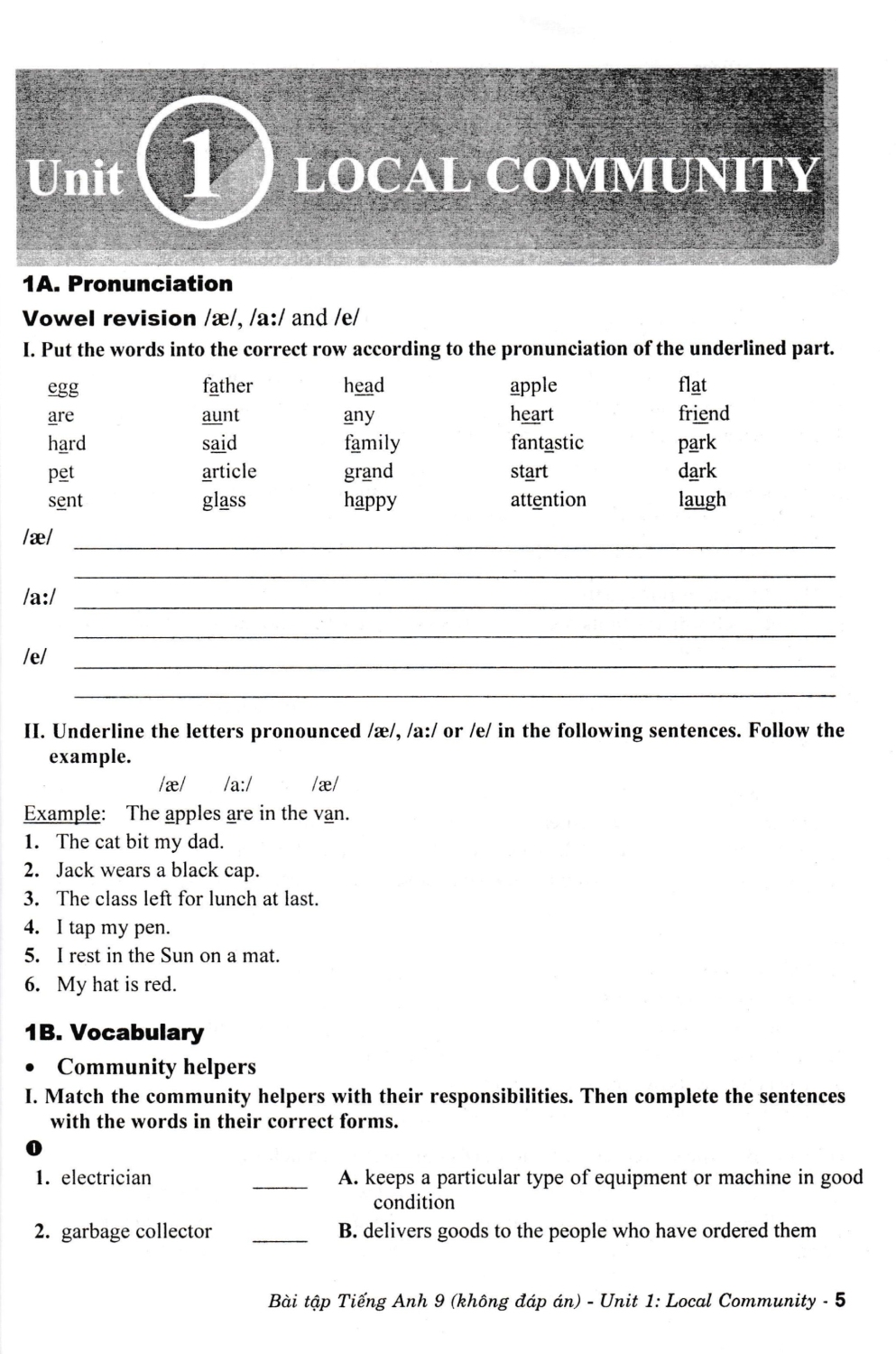 Bài tập dành cho mỗi đơn vị bài học gồm 6 phần: Pronunciation, Vocabulary, Grammar, Speaking, Reading, Writing và hai bài luyện tập Test 1 & 2 gồm 50 câu hỏi kiểm tra với bài tập phát triển các kĩ năng trên. Các bài Review giúp học sinh tự kiểm tra những nội dung kiến thức và rèn luyện các kĩ năng sau mỗi 3 đơn vị bài học.