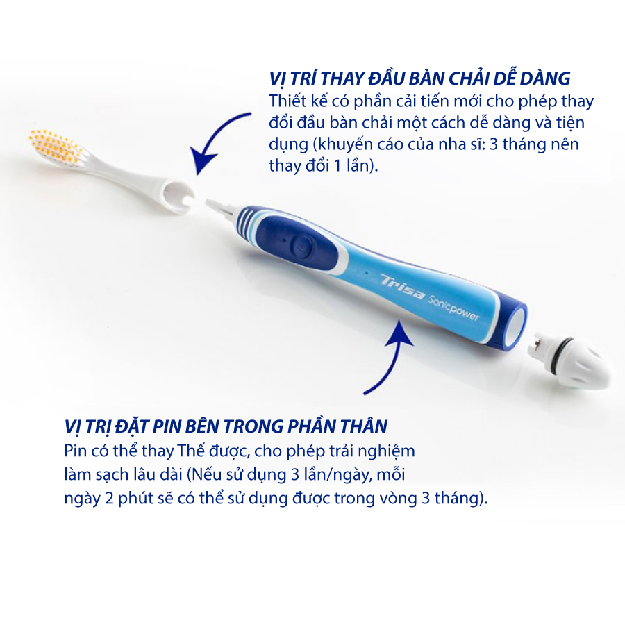Mua tại TiktokBài Chải Pin Trisa Complete Protection Bề mặt chải “Complete Protection” được phát triển một cách khoa học giúp loại bỏ các mảng bám hiệu quả cao, bảo vệ răng và nướu toàn diện, kết hợp với các chuyển động âm thanh tần số cao giúp làm sạch hiệu quả hơn 30%. Pin AAA Batterie đi kèm có thể thay thế được cho phép trải nghiệm làm sạch lâu dài (Nếu sử dụng 3 lần/ngày, mỗi ngày 2 phút sẽ có thể sử dụng được trong vòng 3 tháng). Thiết kế có phần cải tiến mới cho phép thay đổi đầu bàn chải một cách dễ dàng và tiện dụng (khuyến cáo của nha sĩ: 3 tháng nên thay đổi 1 lần). Chống nước tối đa, giúp bạn bảo quản sản phẩm lâu dài hơn Hướng Dẫn Sử Dụng: