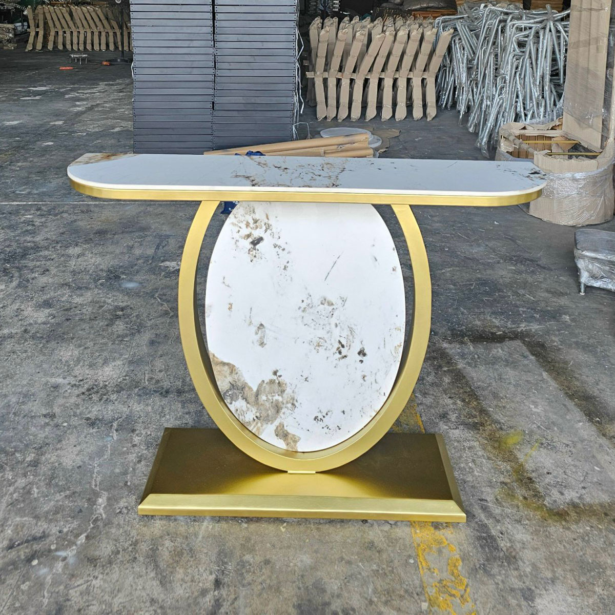 Bàn console, bàn trang trí mặt đá trắng khung sơn vàng CSTCT019 với điểm nhấn khung sắt sơn màu vàng kết hợp mặt đá trắng vân tạo toát lên vẻ đẹp sang trọng giúp nâng tầm giá