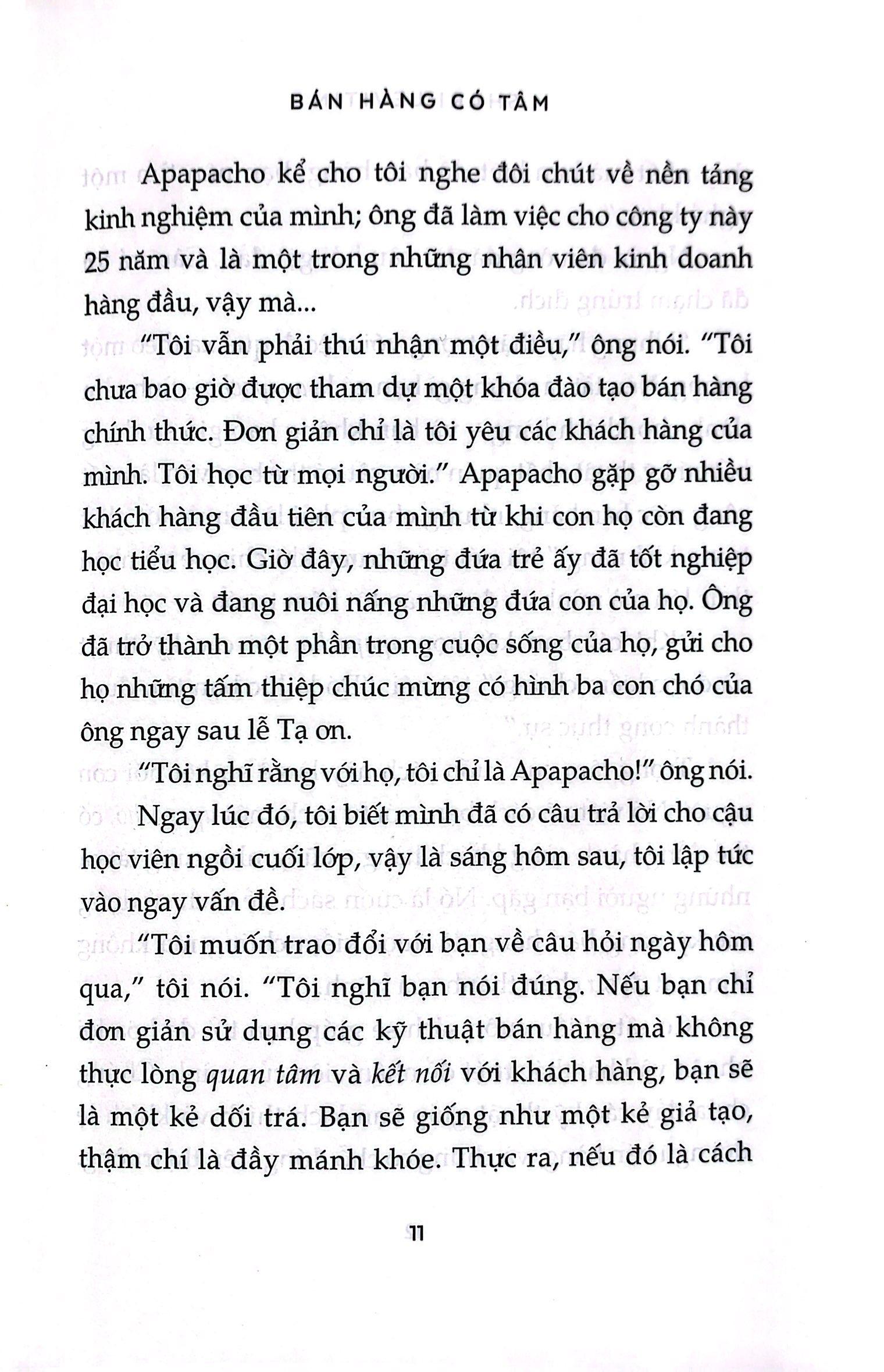 Cuốn sách này sẽ thay đổi suy nghĩ của bạn về cách thức bán hàng từ trước tới nay, đưa bạn đến một ý nghĩa mới của việc bán hàng, được tác giả gọi là bán hàng có tâm.