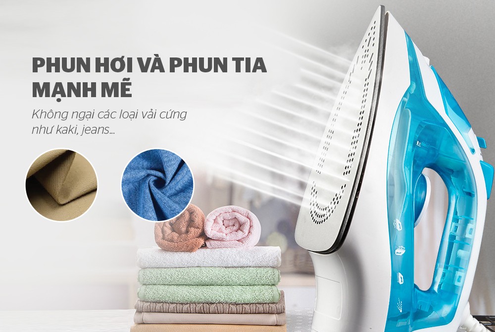 Chế độ là linh hoạt, phù hợp với mọi loại vải 5 chế độ nhiệt phù hợp với các loại vải khác nhau được đánh dấu rõ ràng trên núm vặn (vải bông, vải lanh, vải cotton, lụa, vải thun nylon) giúp bạn dễ dàng lựa chọn nhiệt độ thích hợp cho trang phục. Phun hơi mạnh và liên tục Bàn là có 2 chức năng phun hơi và phun nước, là phẳng cả những loại vải dày và những nếp nhăn cứng đầu nhất.Chế độ phun hơi cực mạnh và đều cùng với chức năng tăng giảm lượng hơi nước linh hoạt giúp ủi đồ nhanh chóng, không làm bóng mặt vải, không làm biến dạng sợi vải. Tùy chỉnh lượng nước/hơi nước thoát ra linh hoạt bằng thanh gạt phía trên. Gạt về vạch 0 nếu bạn đang sử dụng chức năng là khô hoặc không muốn nước/hơi nước thoát ra liên tục. Với vạch MAX và chế độ phun hơi, lượng nước thoát ra trên bề mặt là nhiều và liên tục, nên chọn mức nhiệt độ cao nhất khi sử dụng để bề mặt là đủ nóng biến nước thành hơi nước, tránh hiện tượng rò rỉ.