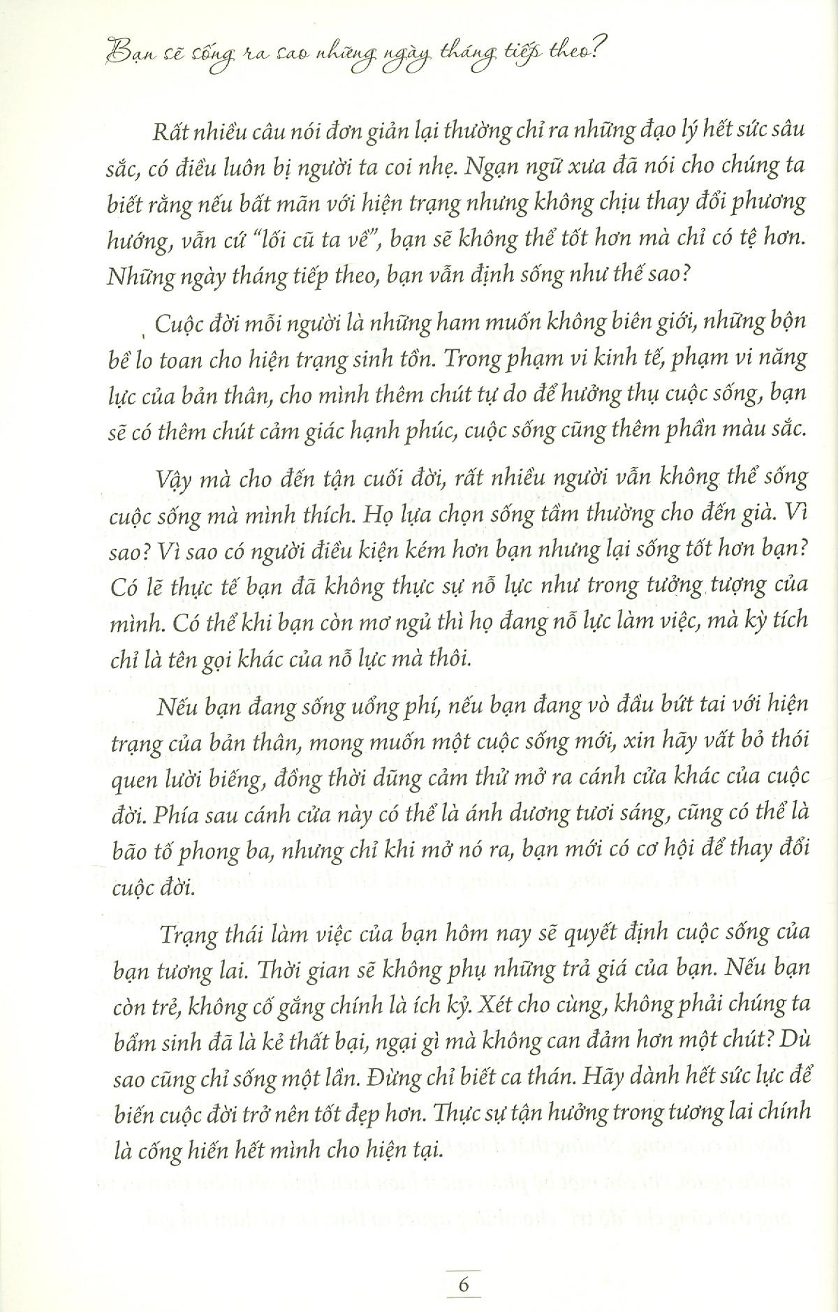 Trạng thái làm việc của bạn hôm nay sẽ quyết định cuộc sống của bạn trong tương lai. Thời gian sẽ không phụ những trả giá của bạn. Nếu bạn còn trẻ, không cố gắng chính là ích kỷ. Xét cho cùng, không phải chúng ta bẩm sinh là kẻ thất bại, ngại gì mà không can đảm hơn một chút? Dù sao cũng chỉ sống một lần. Đừng chỉ biết ca thán. Hãy dành hết sức lực để biến cuộc đời trở nên tốt đẹp hơn. Thực sự tận hưởng trong tương lai chính là cống hiến hết mình cho hiện tại.