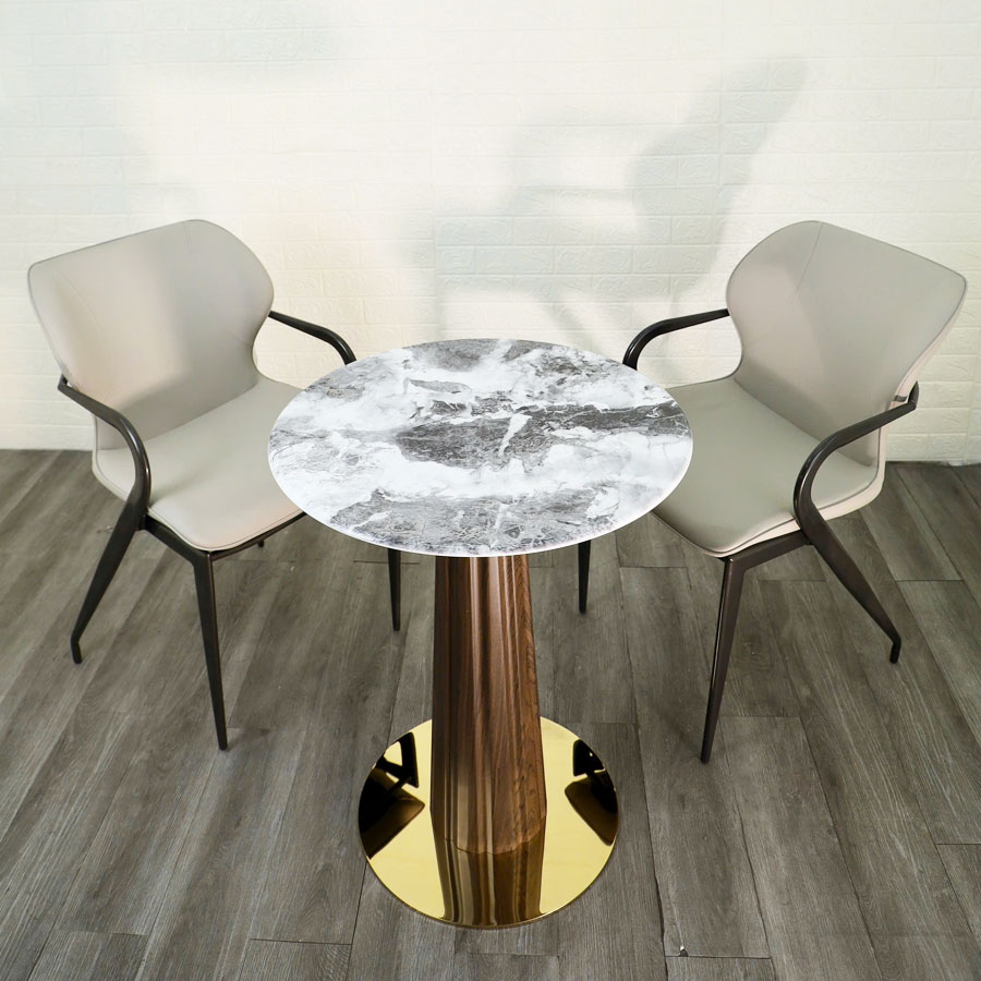 Bàn cafe tiếp khách mặt đá nhỏ gọnChất liệu: Mặt đá pha lê, chân bàn sắt sơn tĩnh điện vân gỗ, đế bàn inox mạ màu vàng sang trọngKích thước: D600*H750mmMàu sắc: Trắng vân bông tuyết, trắng vân đen...