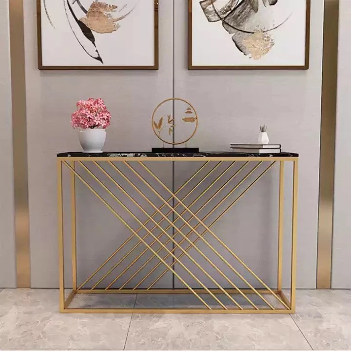 Bàn console, bàn trang trí mặt đá trắng khung sơn vàng CSTCT019 với điểm nhấn khung sắt sơn màu vàng kết hợp mặt đá trắng vân tạo toát lên vẻ đẹp sang trọng giúp nâng tầm giá