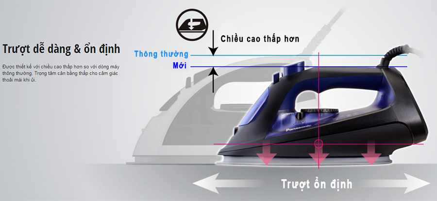 Ngoài ra, bản ủi Panasonic thích hợp với mọi loại vải, có vòng chỉnh nhiệt giúp lựa chọn được mức nhiệt độ phù hợp cho từng loại vải, đèn báo sẽ tự tắt khi đạt mức nhiệt cần thiết, bảo vệ quần áo không bị cháy xém do gặp phải nhiệt độ quá cao. Nổi bật hơn là có cấu tạo các hạt hơi nước siêu nhỏ bao phủ diện tích tích lớn, hiệu quả trong việc loại bỏ các nếp nhăn trên các loại vải tự nhiên như lanh và cotton, không cần phải thay đổi giữa chế độ ủi và phun nước.