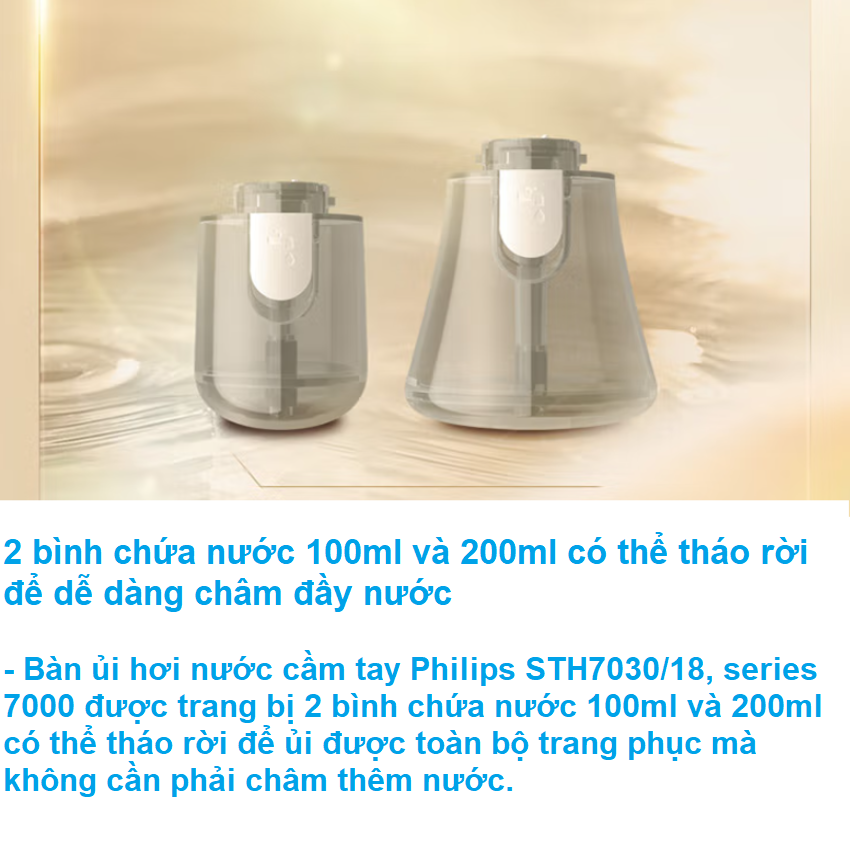 - Bàn ủi hơi nước cầm tay Philips STH7030/18, series 7000 được trang bị 2 bình chứa nước 100ml và 200ml có thể tháo rời để ủi được toàn bộ trang phục mà không cần phải châm thêm nước. Hơi phun tiêu diệt 99,9% vi khuẩn*