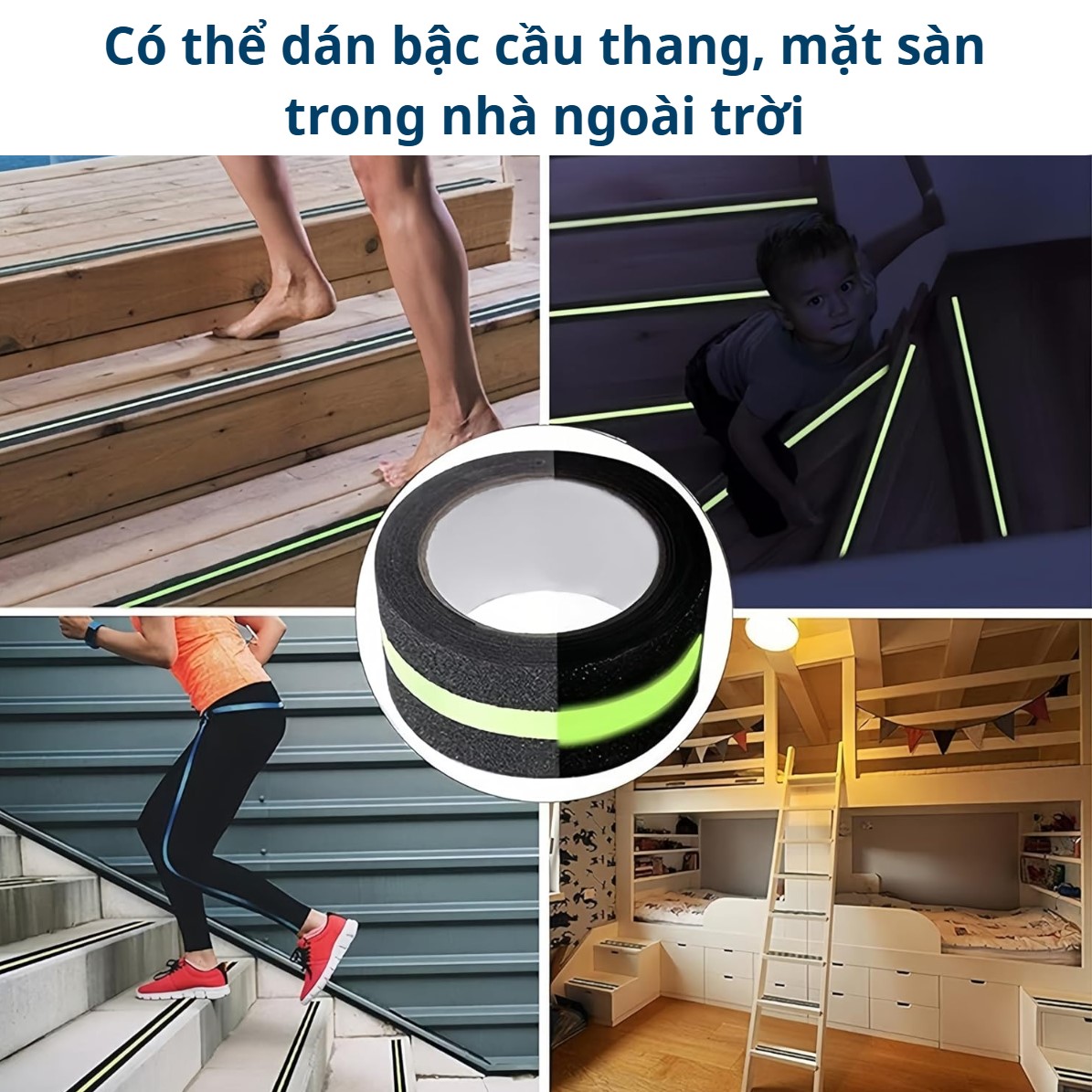 CHÚ Ý: BĂNG KEO CẦN HẤP THỤ ÁNH SÁNG MẠNH ĐỂ PHÁT SÁNG TRONG TỐI, BAN ĐÊM CÔNG DỤNG NỔI BẬT Dạ quang phát sáng ban đêm – dễ nhận biết lối đi, tránh vấp ngã. Bề mặt nhám chống trượt – tăng độ ma sát, chống trơn trượt hiệu quả. Dính chặt trên nhiều bề mặt – gạch, gỗ, kính, kim loại, đá,... ️ Dễ dàng cắt theo kích thước mong muốn. Phù hợp mọi nơi: cầu thang, sàn nhà, nhà tắm, trường học, bệnh viện, xưởng sản xuất.. ️ THÔNG TIN SẢN PHẨM