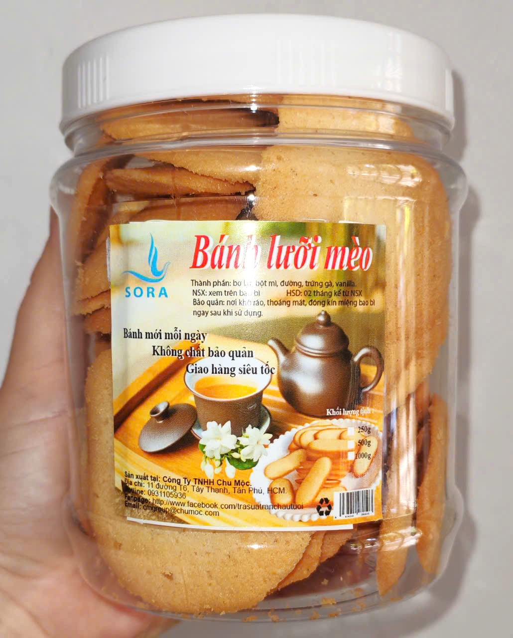 Càng đơn giản lại càng lôi cuốn, Bánh lưỡi mèo kiểu Nhật Sora chính là sự kết hợp hoàn hảo của bơ, trứng, bột, đường tạo nên hương vị thơm ngon thuần túy. Không cầu kì cũng không quá cao sang nhưng cắn một miếng có thể cảm nhận ngay được cái độ giòn, xốp, thơm, beo béo tan ngay trong miệng. Bánh dùng cho tiệc trà, cafe,... hay là món quà dành tặng bé yêu, bạn bè, người thân cũng đều thích hợp nhờ hương thơm giản dị mà tinh tế khó chối từ. - Giòn tan. - Thơm ngon. - Càng ăn càng nghiền. - Không chất bảo quản. - Bánh mới mỗi ngày. Bánh lưỡi mèo kiểu Nhật Sora được đóng hộp lịch sự, kín đáo giúp lưu giữ trọn vẹn độ giòn thơm của sản phẩm. BẢO QUẢN: - Bảo quản nơi khô ráo, thoáng mát, tránh ánh nắng trực tiếp. - Đậy kín bao bì ngay sau khi sử dụng, NSX : Công ty TNHH Chu Mộc