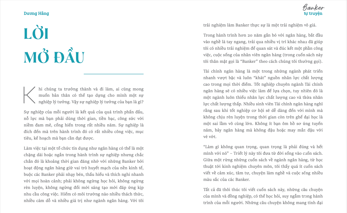 Tôi tin rằng những câu chuyện trong cuốn sách này sẽ thú vị và truyền cảm hứng cho các bạn trẻ yêu thích môi trường ngân hàng và có mục tiêu rõ ràng trong sự nghiệp của mình." - Tác giả Dương Hằng.