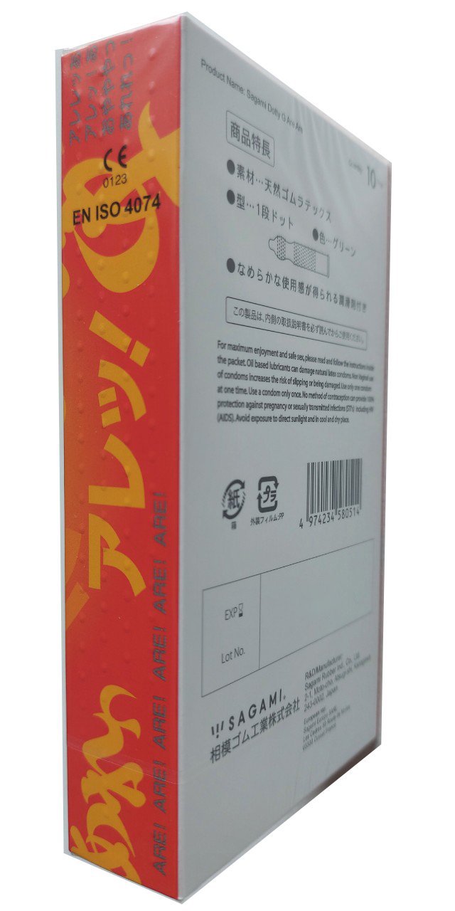 - Bao cao su Sagami Are Are là dòng sản phẩm có gai nhỏ - chấm nổi, một lần thắt của Sagami – Nhà sản xuất bao cao su đầu tiên tại Nhật Bản. TÍNH NĂNG SẢN PHẨM bao cao su Sagami Are Are