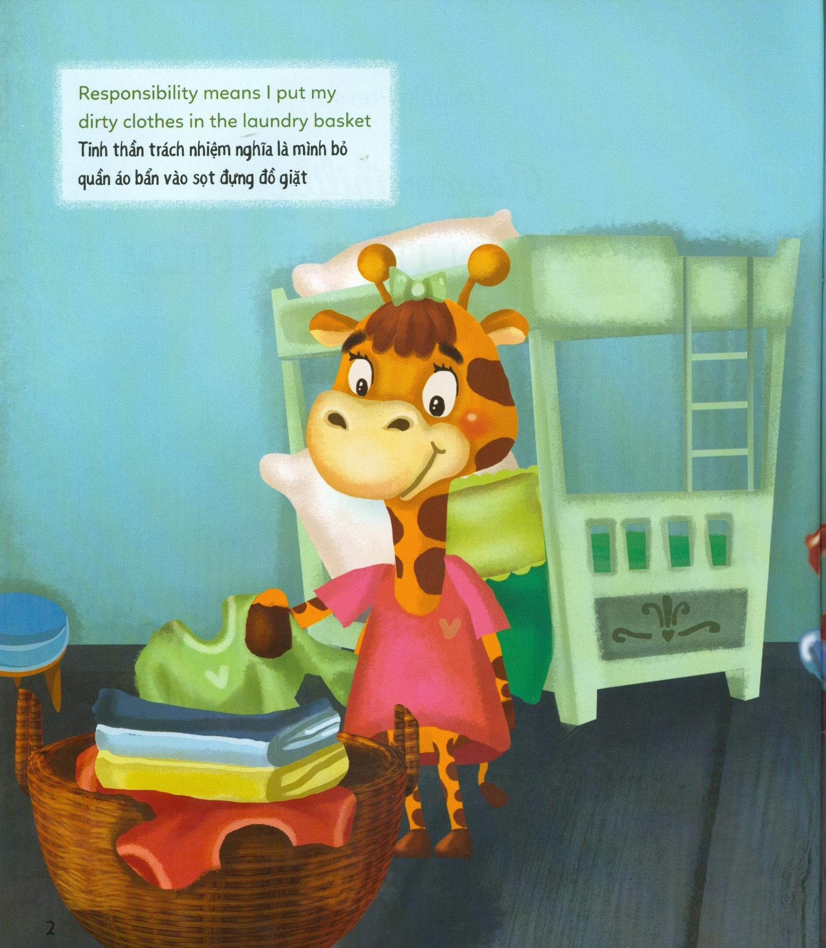 Bạn Rùa kiên trì – kiên trì nghĩa là mình vẫn tiếp tục cố gắng, dù mọi thứ thật khó khăn. Bạn Mèo biết ơn – biết ơn nghĩa là mình cảm ơn vì những gì mình có và mình tìm cách để thể hiện lòng biết ơn đó. Bạn Hưu cao cổ Tinh thần Trách nhiệm - tinh thần trách nhiệm nghĩa là mình làm những việc cần được làm. Bạn Khỉ Tử tế - Tử tế nghĩa là mình vui vẻ sẻ chia hoặc cho người khác những gì mình có. Bạn Gấu Trung thực – Trung thực nghĩa là luôn luôn nói sự thật và chỉ nói sự thật mà thôi…
