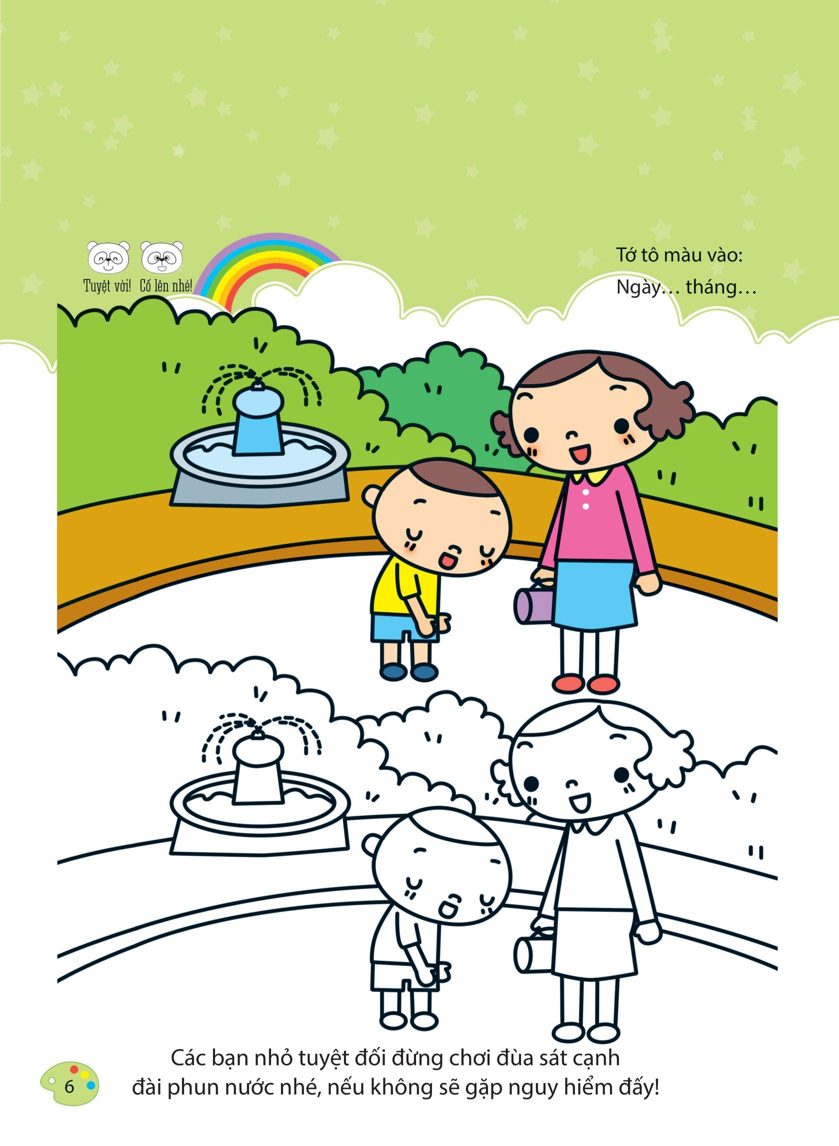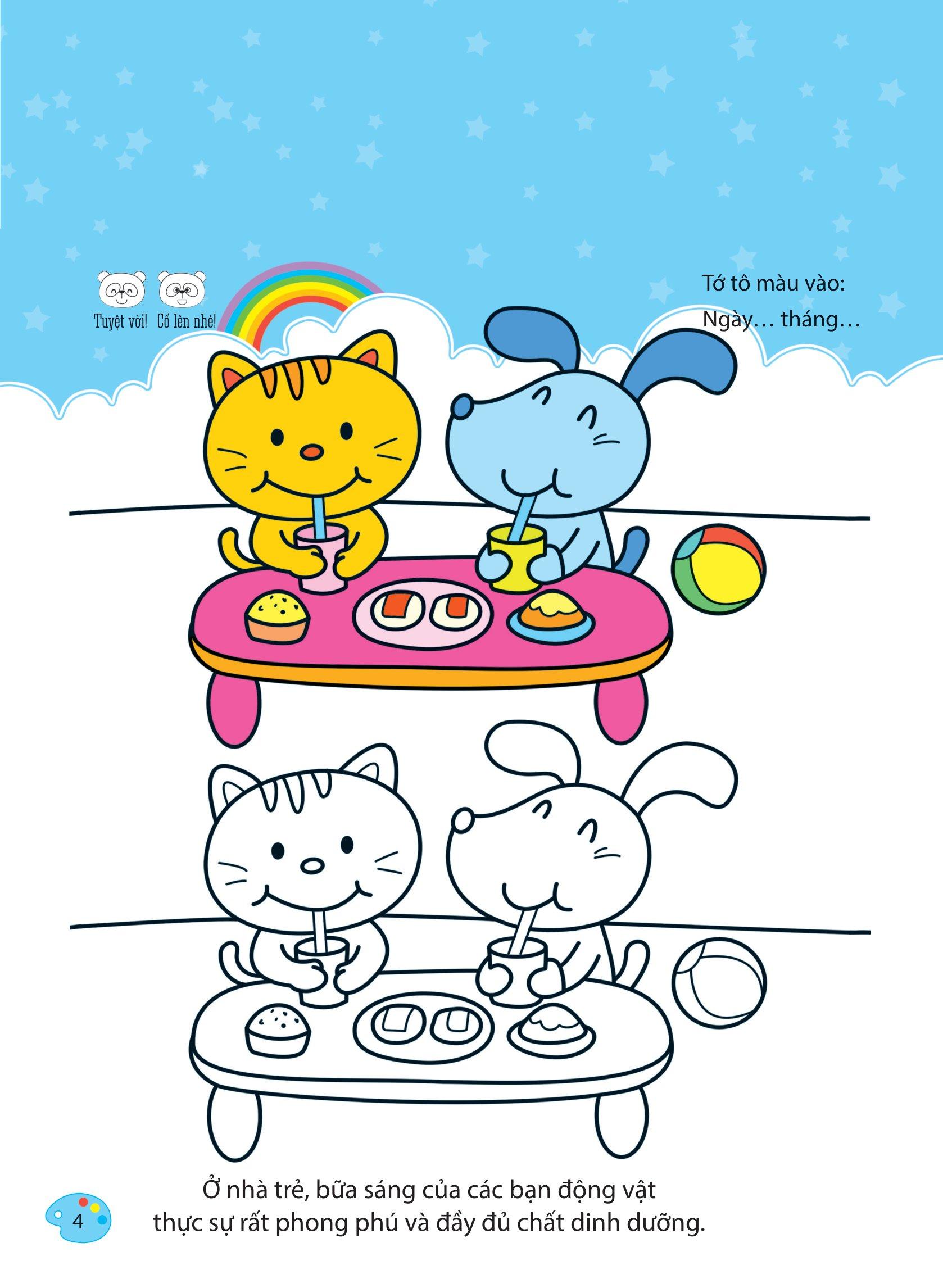 Ngoài việc tô màu theo sự sáng tạo riêng của mỗi bé, sách có gợi ý màu sắc, hình tô mẫu để các bé có thể dễ tưởng tượng và ghi nhớ được hình dạng và màu sắc.