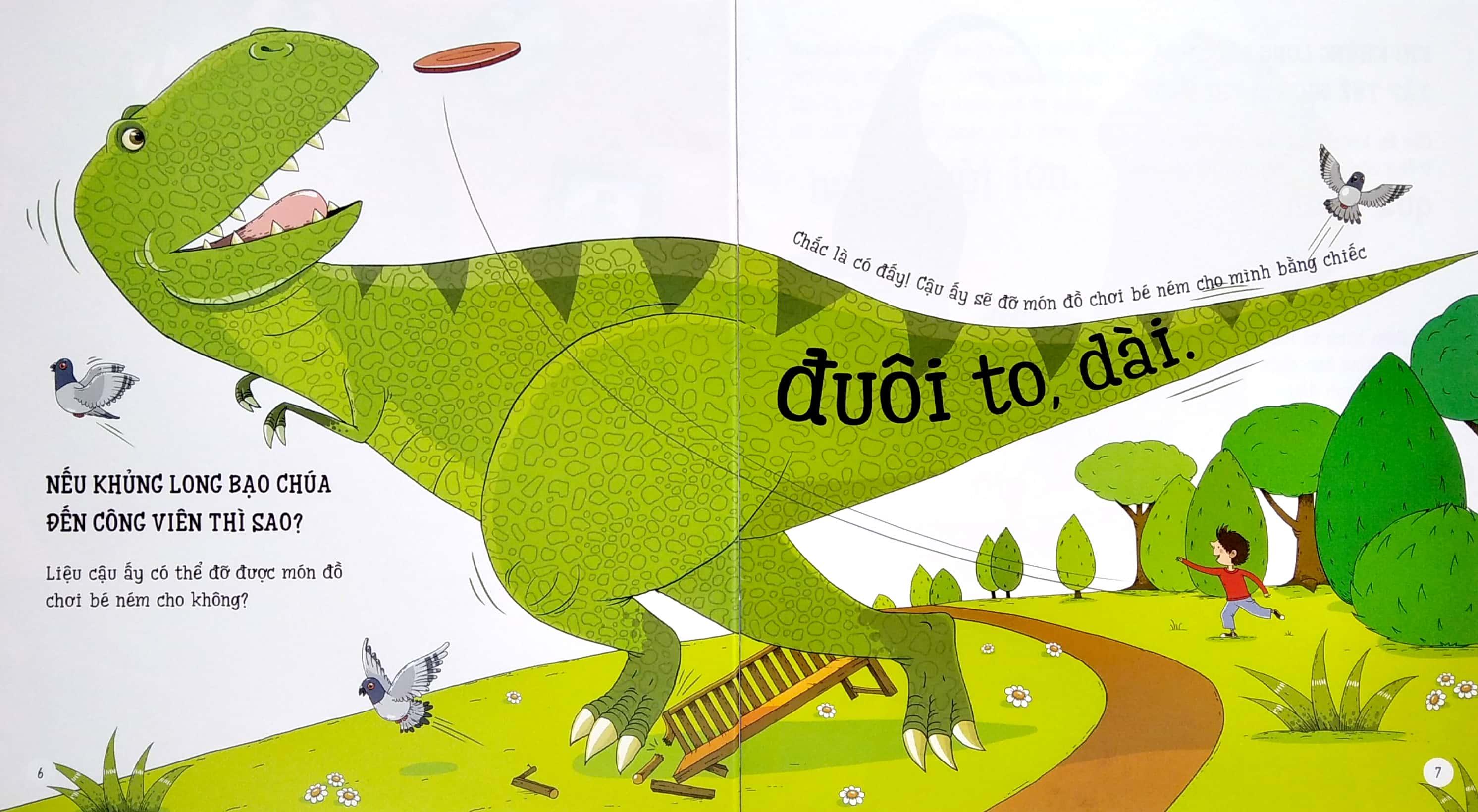 • Nế khủng long bạo chúa dạo chơi trong thành phố: Hãy tưởng tượng, nếu khủng long bạo chúa còn sống tới ngày nay, chắc chắn, bé sẽ vô cùng bất ngờ khi phát hiện ra cậu ấy: có thể nuốt gọn 2.000 chiếc bánh mì kẹp thịt, có những chiếc răng to bằng cả quả chuối, có thể nghiền được cả đống rác chỉ trong chớp mắt… Và còn bao nhiêu điều kinh ngạc khác về khủng long bạo chúa đang chờ bé khám phá!