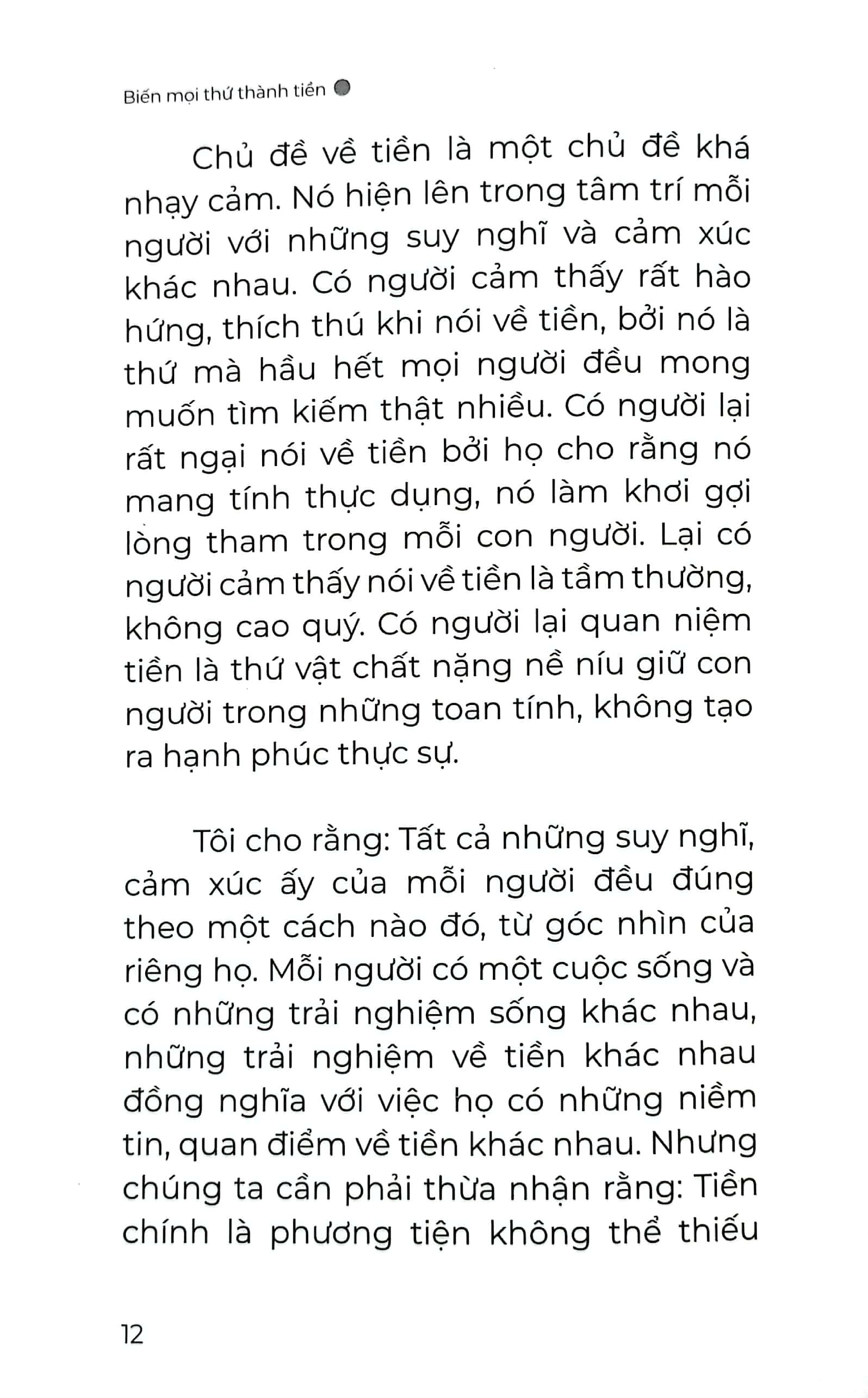 Bí quyết giúp bạn thoát nghèo để đạt được thành công và giàu có thực sự “Biến mọi thứ thành tiền” là cuốn sách xoay quanh chủ đề tài chính cá nhân. Đây là vấn đề đang được nhiều người, trong đó có các bạn trẻ đặc biệt quan tâm. Cuốn sách định hướng người đọc về cách kiếm tiền, tư duy làm giàu, cách áp dụng những phương pháp làm giàu vào cuộc sống và phát triển bản thân. Bí quyết giúp bạn thoát nghèo để đạt được thành công và giàu có thực sự ở đây không phải là công thức cho tất cả mọi người.