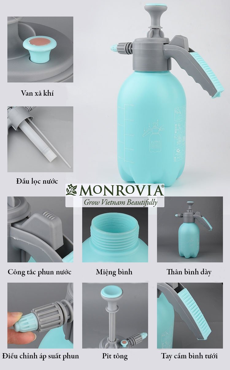 - Ngoài ra, có thể sử dụng bình tưới cây 2 lít để phun chất lỏng diệt muỗi, tưới hoa và cỏ, dọn dẹp nhà cửa, vệ sinh và khử trùng. Lưu ý khi sử dụng bình xịt tưới cây MONROVIA