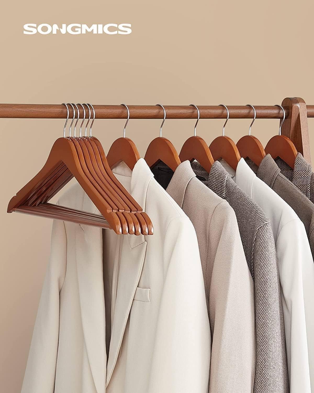 Một món đồ bắt mắt trong tủ quần áo của bạn: trên những chiếc móc treo này, gây ấn tượng với màu óc chó sẫm và bề mặt nhẵn dễ chịu, những bộ quần áo
