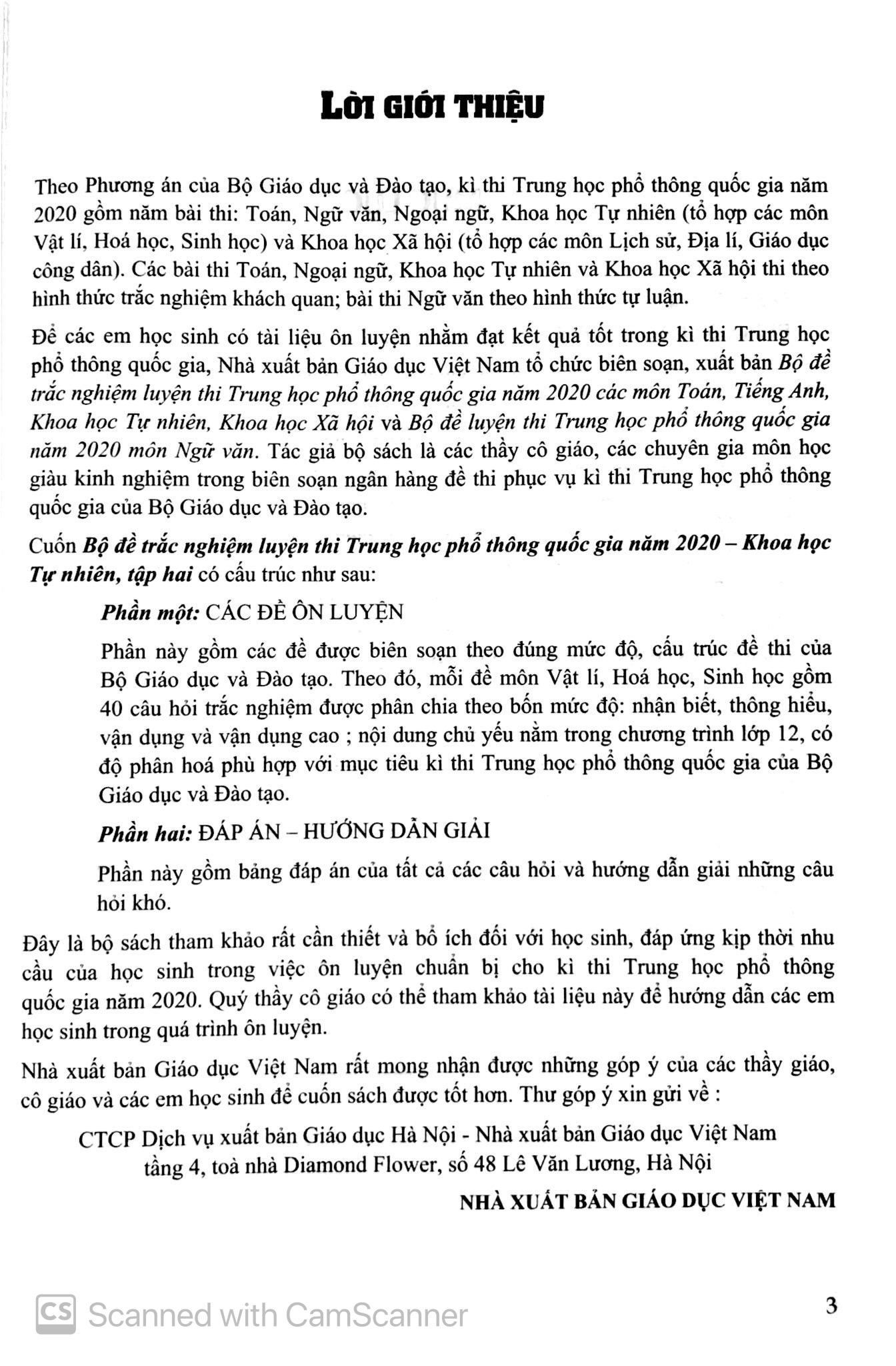 Kỳ thi THPT Quốc gia năm 2020 được Bộ Giáo dục và Đào tạo chỉ đạo định hướng nhằm đánh giá chính xác kết quả học tập của học sinh sau 12 năm học ở mức độ học vấn phổ thông, làm cơ sở cho tuyển sinh giáo dục đại học, giáo dục nghề nghiệp theo tinh thần tự chủ tuyển sinh. Dựa trên định hướng đó, bộ đề luyện thi THPT Quốc gia 2020 – Khoa học tự nhiên nằm trong “Bộ đề trắc nghiệm luyện thi THPT Quốc gia 2020” được Nhà xuất bản Giáo dục Việt Nam biên soạn và xuất bản nhằm đáp ứng kịp thời nhu cầu ôn tập và rèn luyện cấp thiết cho các em học sinh lớp 12 khoá 2019 – 2020, chuẩn bị cho Kỳ thi THPT Quốc gia 2020.
