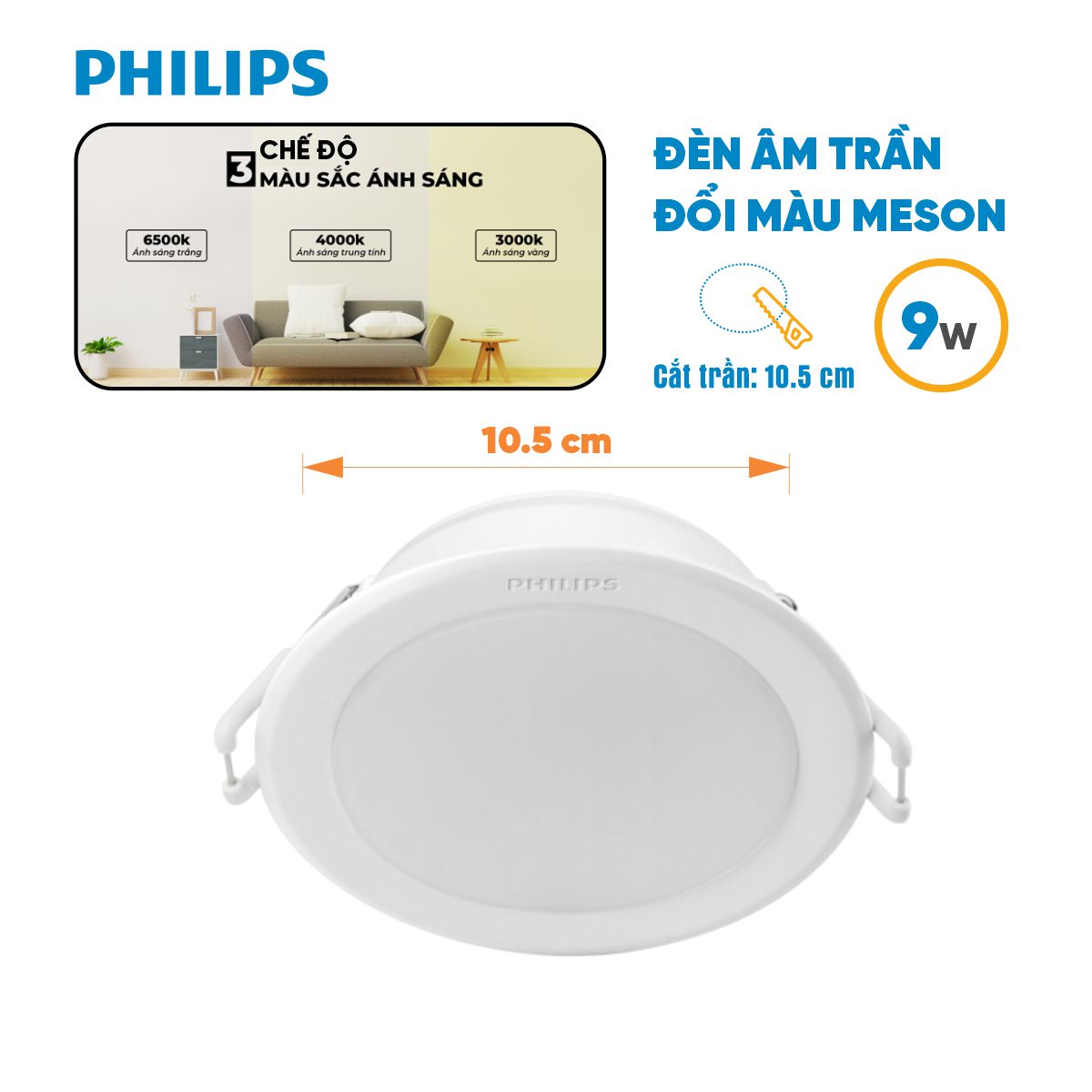 Đường kính khoét lỗ / Công suất: 90/7W. Dải điện áp hoạt động: (150V - 250V)/50Hz Quang thông: 510lm/550lm/470lm Nhiệt độ màu: Sáng trắng 6500K/ trung tính 4000K/ Sáng vàng 3000K -> Tắt bật công