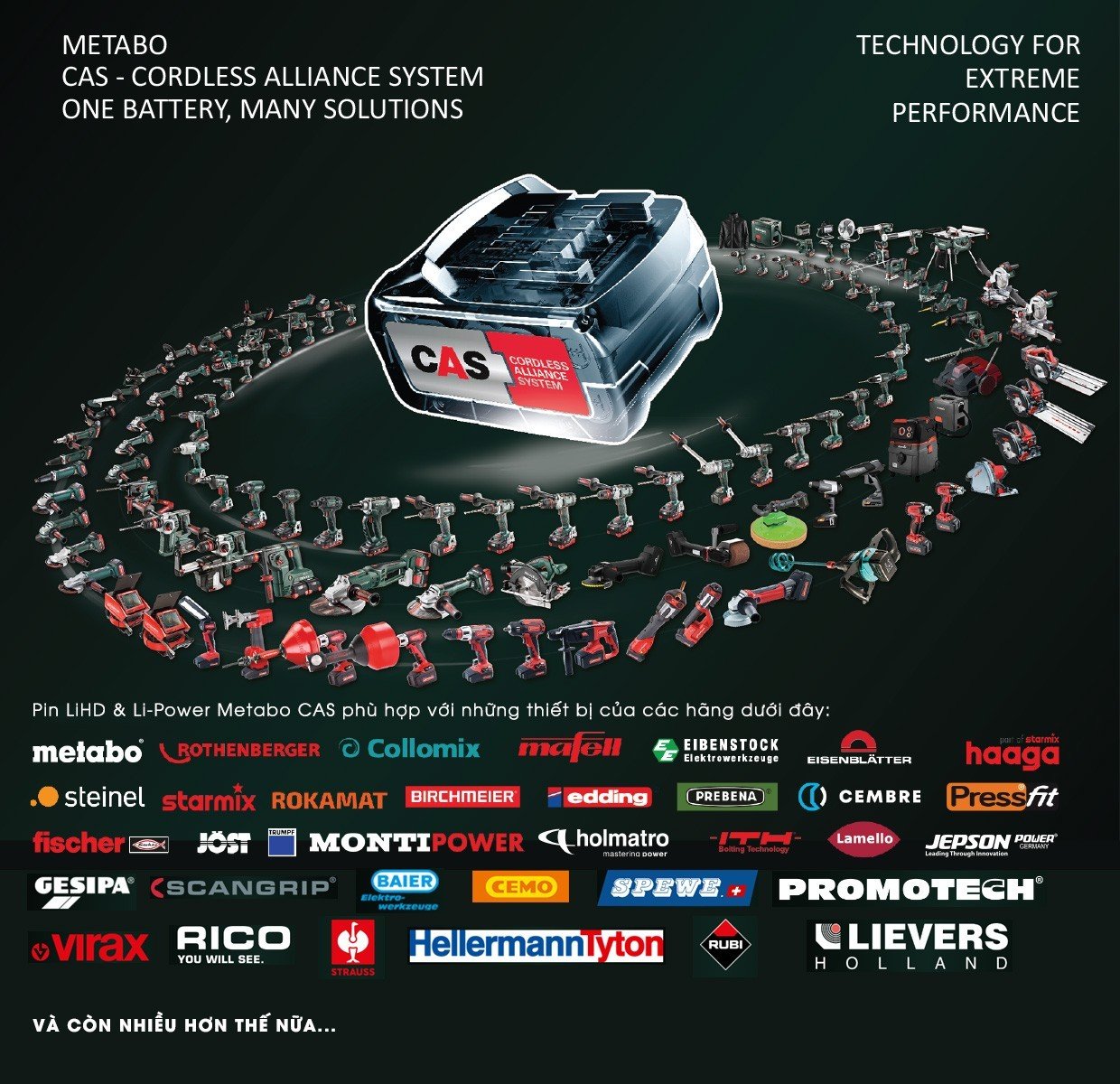 - 3x Pin LiHD Metabo 18V - 4.0 AH: cho hiệu suất tối ưu, sử dụng cực kỳ lâu cho mỗi lần sạc vì khả năng sinh nhiệt rất thấp c dùng với công nghệ quản lý pin thông minh, giúp kéo dài tuổi thọ cho pin ít nhất 3 năm