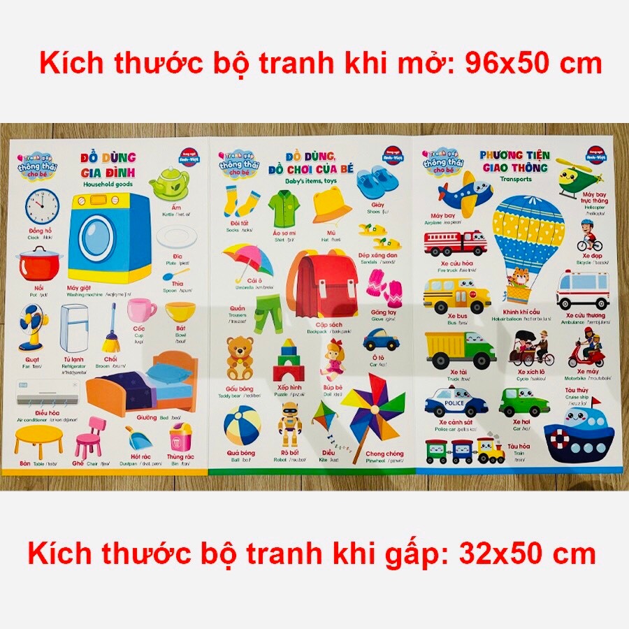 ✨Bộ Tranh Gấp Thông Thái Cho Bé - Song Ngữ Anh Việt - 3 Tấm, 6 Mặt, 17 Chủ Đề, Kích Thước 96 x 50cm