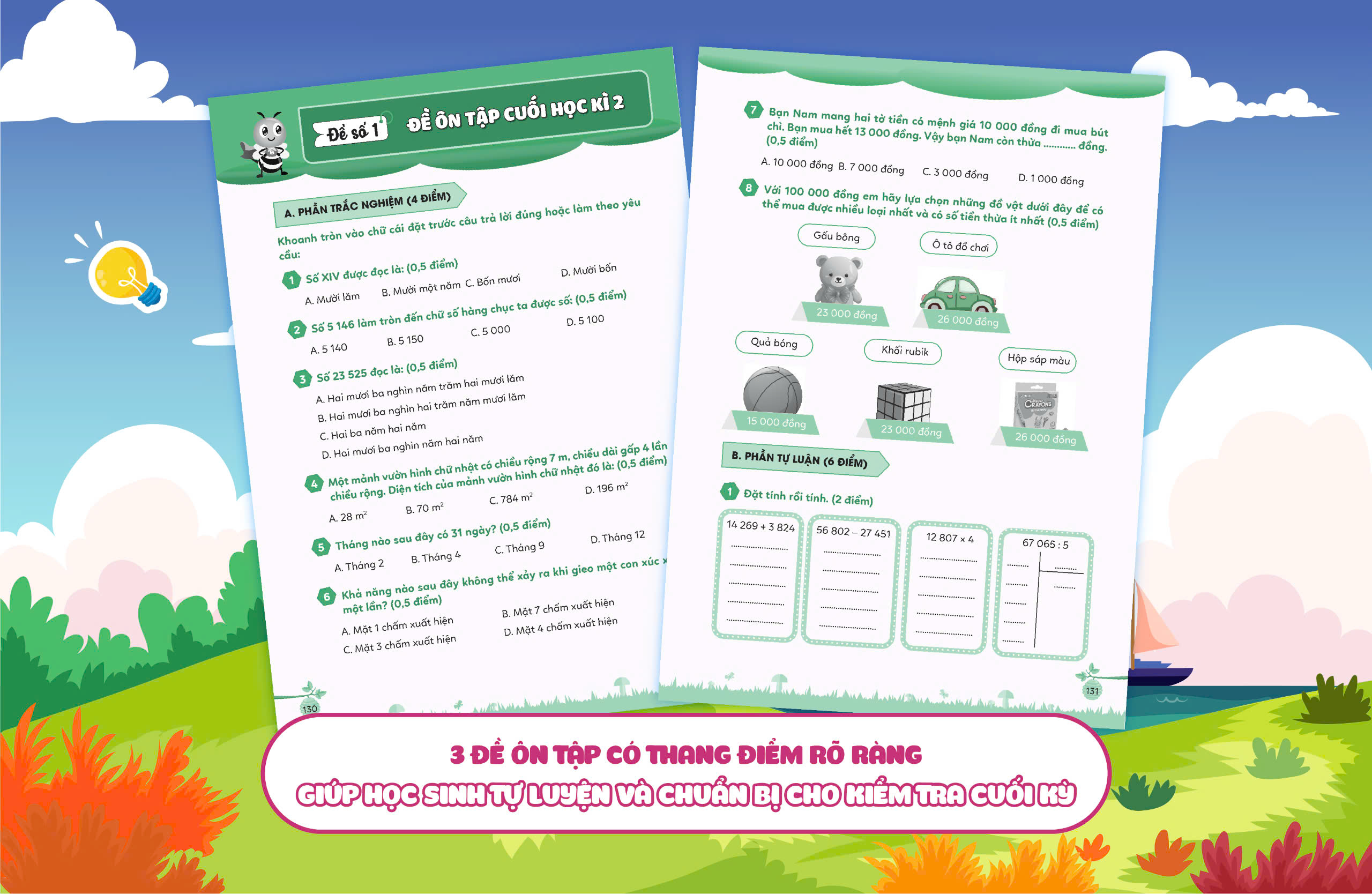 Cuốn sách cũng cung cấp 3 đề ôn tập cuối kì với thang điểm cụ thể, để các em tự ôn luyện và đánh giá đúng mức độ nắm kiến thức, chuẩn bị tốt kiến thức và tâm lý cho bài kiểm tra cuối kì.