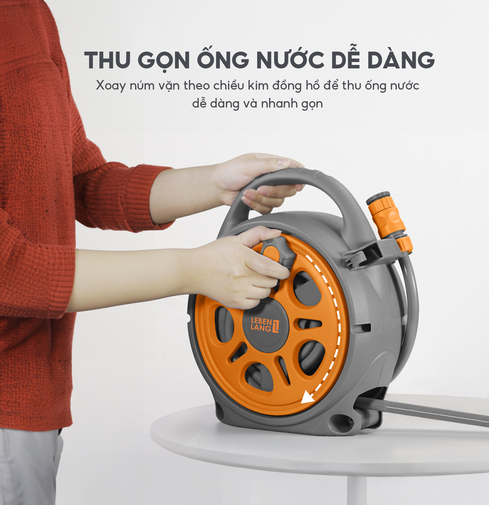 - Bộ vòi phun Lebenlang Thu Gọn Dễ Dàng: Thu cuộn ống nước dễ dàng bằng cách xoay núm vặn chiều kim đồng hồ, giúp tiết kiệm không gian và di chuyển dễ dàng.
