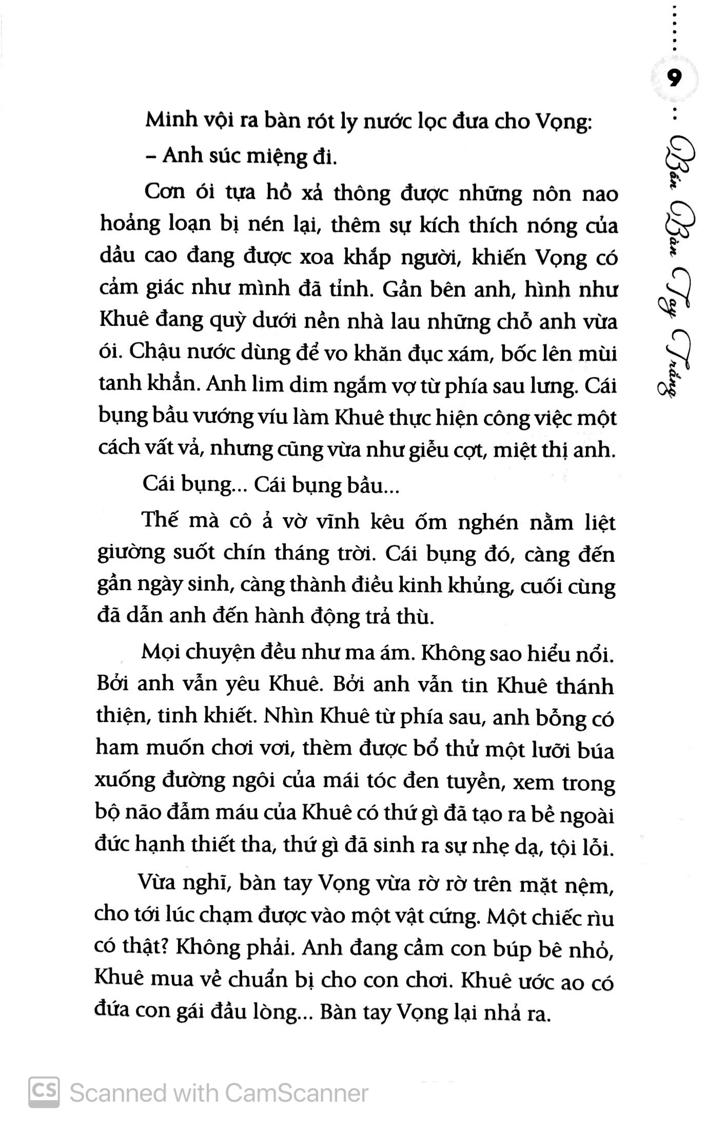 'Mọi chuyện đều như ma ám. Không sao hiểu nổi. Bởi anh vẫn yêu Khuê. Bởi anh vẫn tin Khuê thánh thiện, tinh khiết. Nhìn Khuê từ phía sau, anh bỗng có ham muốn chơi vơi, thèm được bổ thử một lưỡi búa xuống đường ngôi của mái tóc đen tuyền, xem trong bộ não đẫm máu của Khuê có thứ gì đã tạo ra bề ngoài đức hạnh thiết tha, thứ gì đã sinh ra sự nhẹ dạ, tội lỗi.