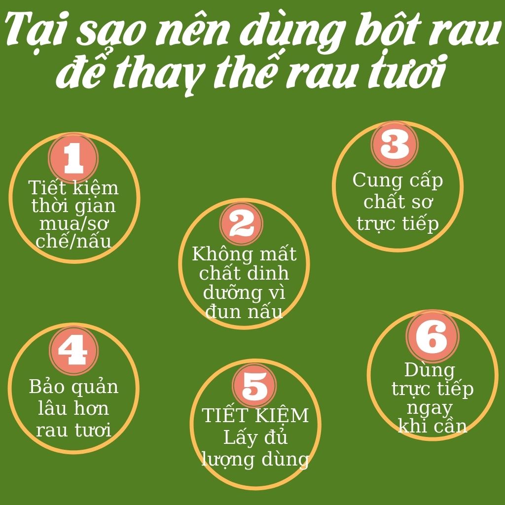 - Nguy cơ gây bệnh ung thư tăng cao; Chỉ cần 1 gói bột rau tiện dụng tại nơi làm việc, thêm vào món ăn/thức uống, là bạn đã bổ sung được lượng rau củ cần thiết cho cơ thể theo cách nhanh nhất. Các Spa / Người làm mặt nạ (mask) từ công thức có rau củ: tiết kiệm thời gian rửa / xay / don dẹp / bảo quản rau củ còn lại. Người hay đi du lịch / công tác: Khi đi đến một nơi xa lạ, bạn có thể không quen với cách nấu / thực phẩm nơi đó / hoặc nơi bạn đến rau xanh quá mắc & bạn không đủ rau xanh trong khẩu phần ăn, dẫn đến bạn dễ BỊ TÁO BÓN & NHIỆT MIỆNG. Mang theo 1 gói bột rau củ rất gọn nhẹ là giải pháp tối ưu của bạn. Chỉ cần bỏ vào chai nước lắc đều lên uống / hoặc cho vào mỳ ly,… là đã giảm nguy cơ táo bón, nhiệt miệng do thiếu chất xơ. Người tập gym / detox / giảm cân: loại rau được khuyên nên ăn: Người ăn theo chế độ ăn thực dưỡng / Eat Plant (ăn thực vật): cần tìm nguồn rau củ có nguồn gốc được trồng theo hướng hữu cơ . Lưu ý