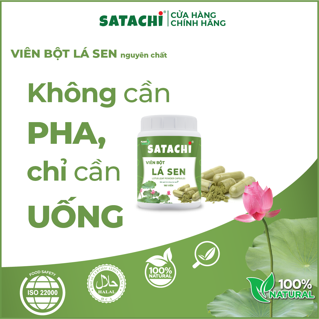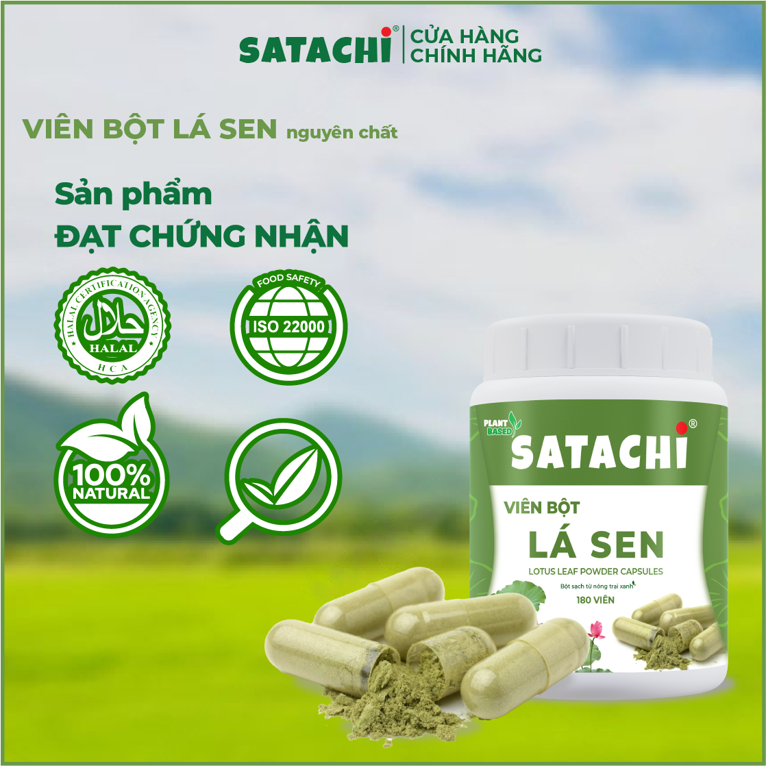 Viên Bột Lá Sen Nguyên Chất SATACHI – 100% Lá Sen – Dạng Viên Tiện Lợi – Hộp 180 viên Viên Bột Lá Sen Satachi được sản xuất từ 100% lá sen nguyên chất, áp