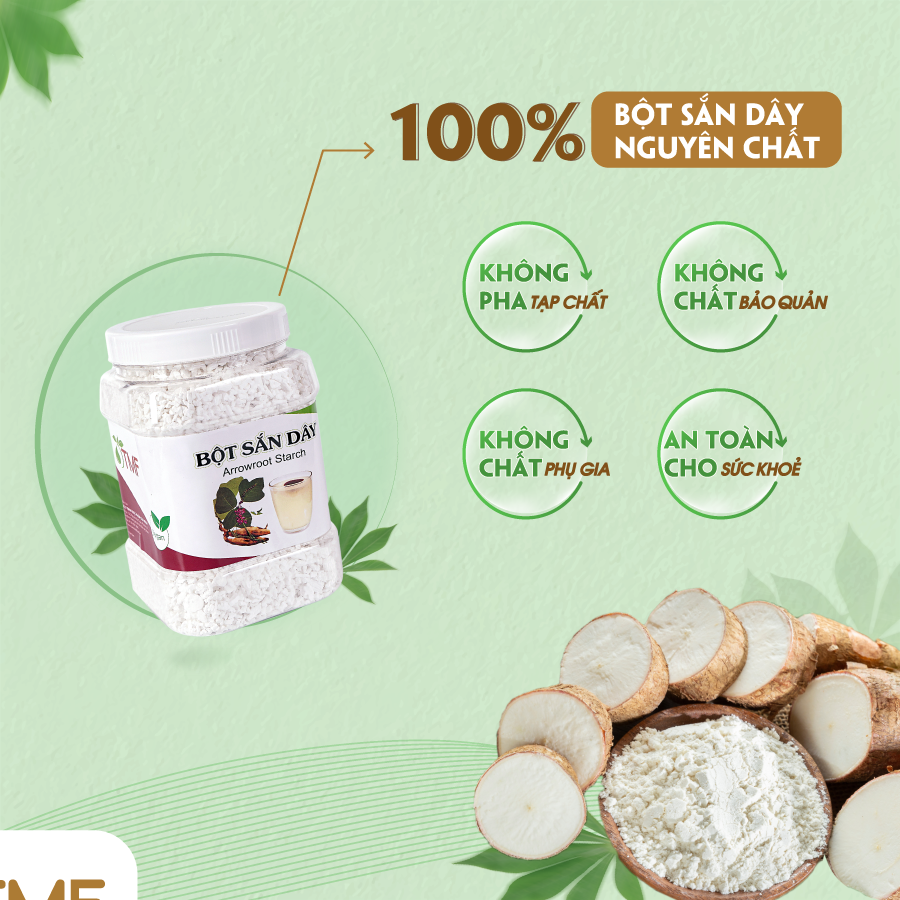 THÔNG TIN SẢN PHẨM: BỘT SẮN DÂY NGUYÊN CHẤT Thành phần: 100% bột sắn dây nguyên chất, không pha lẫn tạp chất.   Bột sắn dây là tinh bột của củ sắn dây, được chiết xuất qua nhiều nước khá tỉ mỉ, giai đoạn thu hoạch đến chiếc xuất, tách bột và phơi khô.   Bột sắn dây nguyên chất được chế biến từ cây sắn dây và dùng nhiều trong đời sống hàng ngày. Bột sắn dây là loại thực phẩm vừa được dùng để pha thành thức uống, vừa được nấu chín để ăn như món chè, sú   Hướng dẫn sử dụng bột sắn dây nguyên chất: pha bột sắn dây với nước ấm theo tỷ lệ thích hợp để uống. Ngoài ra có thể đun trên bếp, khuấy đều đến khi chín. Ngoài ra, bạn cũng có thể khuấy bột sắn dây trên bếp cho sánh đặc rồi ăn, dùng mỗi ngày rất tốt cho sức khỏe và thanh lọc cơ thể.   Cách bảo quản: nơi khô ráo và thoáng mát, không sử dụng khi sản phẩm nấm mốc, có mùi vị lạ. Ngày sản xuất: xem trên bao bì Hạn sử dụng: 12 tháng kể từ ngày sản xuất Sản phẩm làm hoàn toàn tự nhiên, không hoá chất.   Sản xuất tại: CÔNG TY TNHH THỰC PHẨM TÂM MINH. Nhà xưởng B2-1, lô A, đường N5B, khu công nghiệp Lê Minh Xuân 3, huyện Bình Chánh, TP.HCM