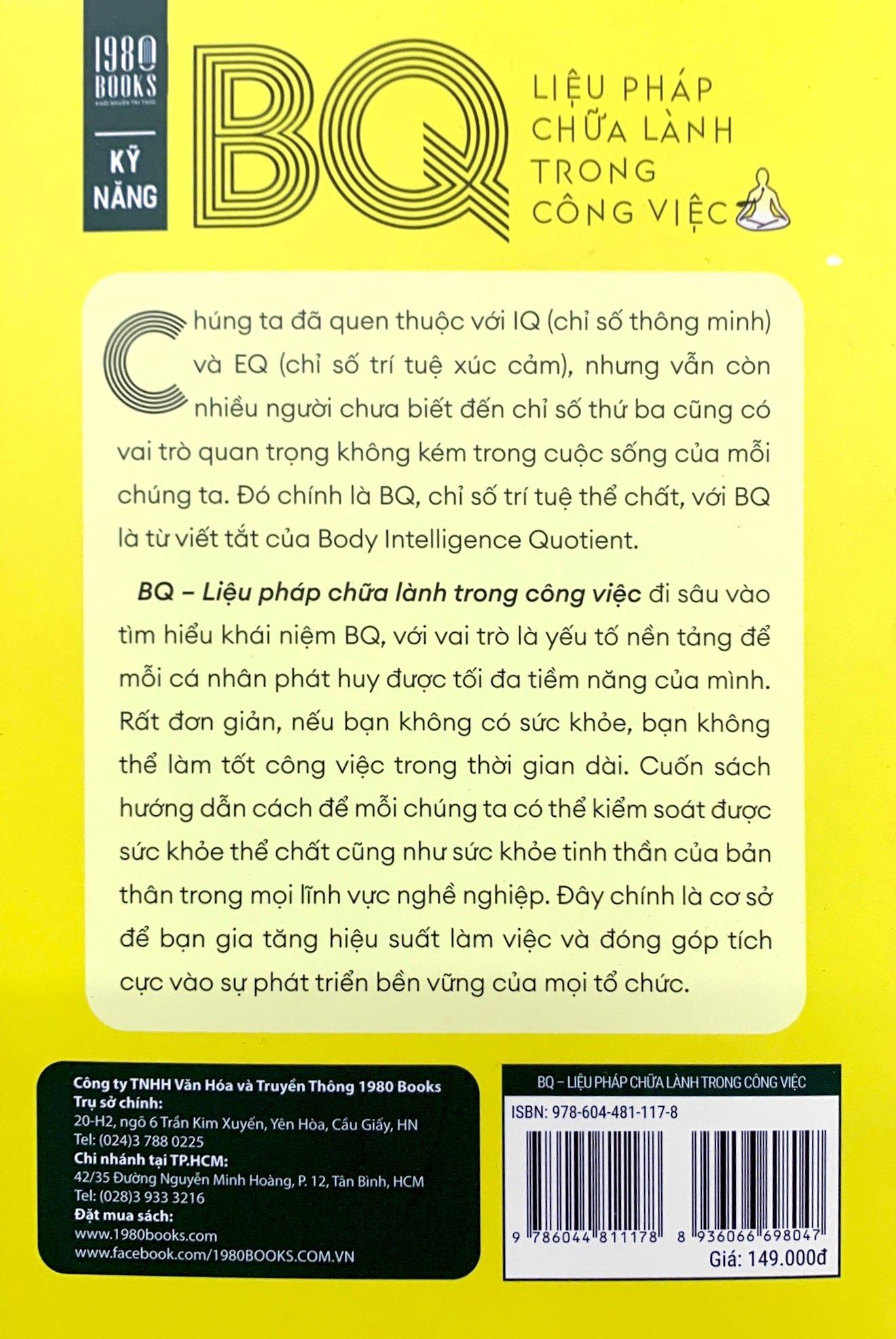 Cuốn sách BQ – Liệu pháp chữa lành trong công việc đi sâu vào tìm hiểu khái niệm BQ, với vai trò là yếu tố nền tảng để mỗi cá nhân phát huy được tối đa tiềm năng của m.ình. Rất đơn giản, nếu bạn không có sức khỏe, bạn không thể làm tốt công việc trong thời gian dài. Cuốn sách hướng dẫn cách để mỗi chúng ta có thể kiểm soát được sức khỏe thể chất cũng như sức khỏe tinh thần của bản thân trong mọi lĩnh vực nghề nghiệp. Đây chính là cơ sở để bạn gia tăng hiệu suất làm việc và đóng góp tích cực vào sự phát triển bền vững của mọi tổ chức.