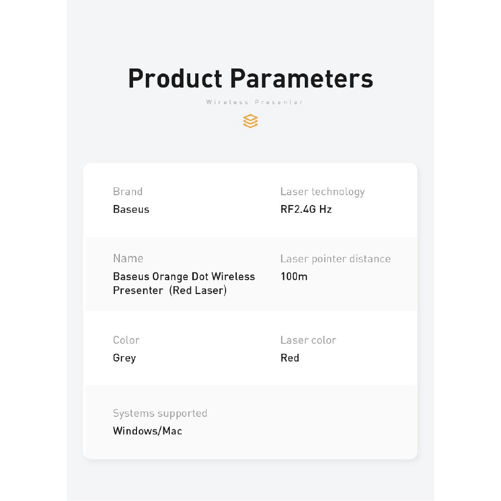 - Bút trình chiếu Baseus Orange Dot Wireless Presenter là một trợ thủ đắc lực không thể thiếu dùng cho các buổi thuyết trình nhờ được trang bị nhiều tính năng tiện dụng, hưu ích và cần thiết như : bút laser (laser poiter), điều hướng slide cho Powerpoint (page up/down), nút mở liên kết, nút tạm dừng khi phát video , nút show/hide
