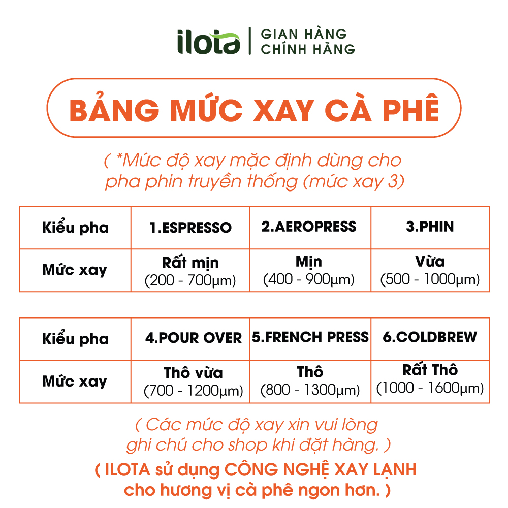 Đặc biệt Bột cà phê ILOTA sử dụng công nghệ xay lạnh (đĩa xay luôn ở 0 độ C) nên cà phê không bị khét và mất hương do quá trình xay lực ma sát sinh nhiệt cao. Đây cũng là tiêu chuẩn quan trọng vì thường cà phê phin xay thường sẽ bị mất nhiều hương (thơm khi xay nhưng không thơm khi uống).