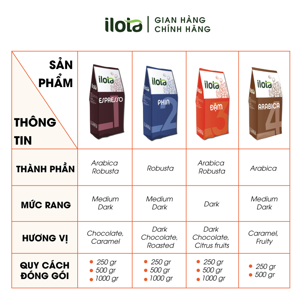 - Hoàn toàn tự nhiên: KHÔNG HƯƠNG LIỆU, KHÔNG HOÁ CHẤT, RANG TƯƠI MỚI, KHÔNG CHẤT BẢO QUẢN. Cà phê ILOTA được rang tươi mới và đóng gói khi nhận đơn đặt hang đảm bảo chất lượng tốt nhất và tươi nhất.