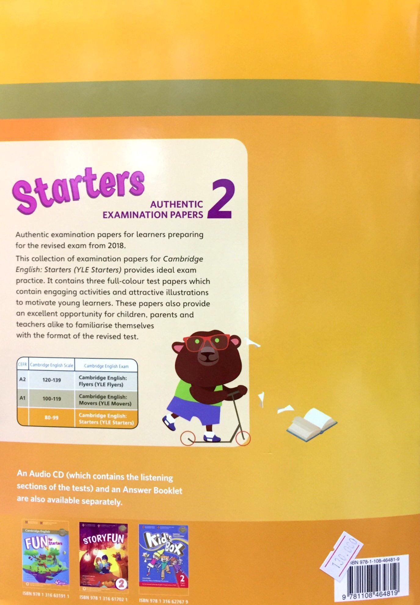 Mua tại TiktokCambridge University Cambridge English Starters 2 for Revised Exam From 2018 Student's Book Authentic examination papers for learners preparing for the revised Cambridge English: Young Learners from 2018. This collection of examination papers for Starters provides ideal exam practice. It contains three full-colour test papers which contain engaging activities and attractive illustrations to motivate young learners. These papers also provide an excellent opportunity for children, parents and teachers alike to familiarise themselves with the format of the revised test .