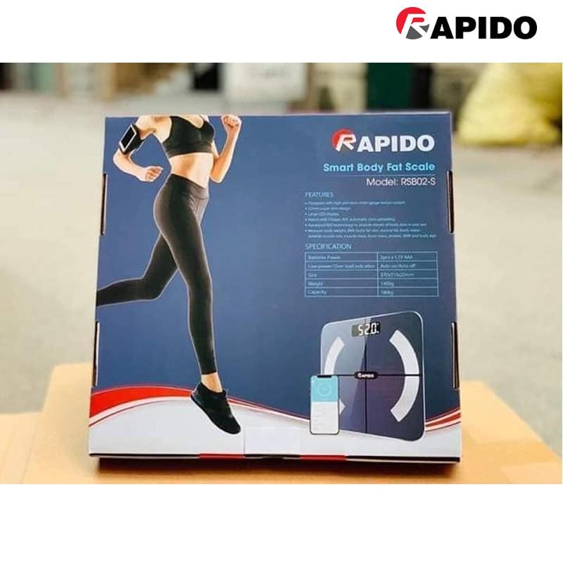 MÔ TẢ SẢN PHẨM Cân Sức Khỏe Thông Minh Rapido RSB04-S (Có bluetooth) - Hàng Chính Hãng - Bảo Hành 12 Tháng Cân sức khỏe thông minh Rapido RSB04-S điều khiển bằng Bluetooth là giải pháp đơn giản giúp bạn và các thành viên gia đình hiểu hơn về cơ thể mình. Sở dĩ cân sức khỏe thông minh Rapido RSB04-S được đánh giá cao vì – Cân sử dụng cảm ứng lực với độ chính xác cao – Dễ dàng sử dụng – Ứng dụng phù hợp với nhiều dòng máy khác nhau. Ngoài chức năng cân nặng, Rapido RSB04-S còn có thể đo được 16 chỉ số bao gồm: Cân nặng, BMI, Tỉ lệ mỡ cơ thể, Tốc độ cơ bắp,