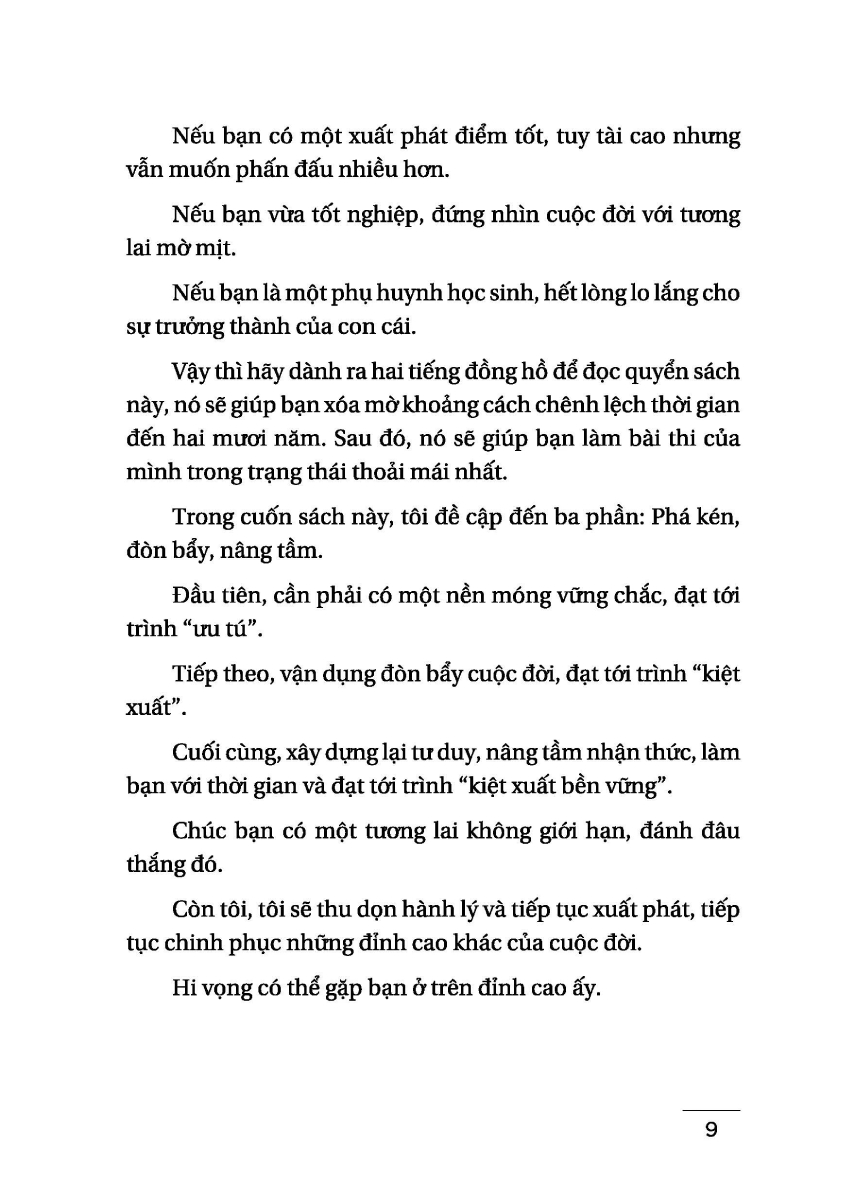 Cao Thủ Học Tập CAO THỦ HỌC TẬP - 2 giờ đọc cuốn sách này sẽ giúp bạn rút ngắn khoảng thời gian 20 năm học tập trong tương lai Làm thế nào để các bạn trẻ đang trong tình trạng mịt mờ có thể trở nên tốt hơn và mạnh mẽ hơn? Câu trả lời nằm gọn trong cuốn sách này. Nó như ngọn lửa không ngừng tiếp thêm cho bạn nguồn động lực vươn lên và cùng bạn theo đuổi ước mơ cao xa không giới hạn của mình. Cuốn sách cho chúng ta nhìn thấy được phương pháp học tập thiên về tiếp thu, phân tích, tổng kết, quy nạp của Trương Tự Hào. Đây là thứ mà rất nhiều người trẻ tuổi muốn thành công đang cần. Tác giả Trương Tự Hào là sinh viên đại học đầu tiên trong gia đình của anh; học giả Học viện Stephen A.Schwarzman – Đại học Thanh Hoa; thanh niên xuất sắc toàn cầu Davos; người sáng lập ra Plantag và là đại sứ thương hiệu Thanh niên Trung Quốc với Toeft. Anh sở hữu 5 triệu fan toàn cầu, kết hợp với quá trình tự lực trưởng thành từ một thiếu niên ở thị trấn nhỏ trở thành thạc sỹ đại học Thanh Hoa, sáng tạo và truyền tải những nội dung tri thức và phong cách sống, tái hiện lại trách nhiệm xã hội và tinh thần dũng cảm của lớp thanh niên trẻ tuổi ngày nay, ngày càng cổ vũ khích lệ được nhiều người hơn phấn đấu vươn lên. Nếu bạn có xuất thân bình thường, tư chất bình thường, nhưng đều muốn chinh phục mọi đỉnh cao trên con đường học hành. Nếu bạn có một xuất phát điểm tốt, tuy tài cao nhưng vẫn muốn phấn đấu nhiều hơn. Nếu bạn vừa tốt nghiệp, đứng nhìn cuộc đời với tương lai mờ mịt. Nếu bạn là một phụ huynh học sinh, hết lòng lo lắng cho sự trưởng thành của con cái. Vậy thì hãy dành ra hai tiếng đồng hồ để đọc quyển sách này, nó sẽ giúp bạn xóa mờ khoảng cách chênh lệch thời gian đến hai mươi năm. Sau đó, nó sẽ giúp bạn làm bài thi của mình trong trạng thái thoải mái nhất. Tác giả đề cập đến ba phần: Phá bỏ, đòn bẩy, nâng tầm. Đầu tiên, cần phải có một nền móng vững chắc, đạt tới trình “ưu tú”. Tiếp theo, vận dụng đòn bẩy cuộc đời, đạt tới trình “kiệt xuất”. Cuối cùng, xây dựng lại tư duy, nâng tầm nhận thức, làm bạn với thời gian và đạt tới trình “kiệt xuất bền vững”. Ngày nhỏ, tác giả từng rất ngưỡng mộ những bạn được cha mẹ chăm bẵm, khi gặp phải những vấn đề rắc rối trong học tập thì luôn có cha mẹ giúp đỡ. Anh cũng từng trách móc cha mẹ của mình rằng tại sao trong việc học hành, họ không thể giúp gì được cho mình? Tại sao họ đều chỉ mới tốt nghiệp tiểu học? Ngoài việc nhận thức bản thân có xuất thân bình thường, tấc giả còn biết rõ mình không phải là thiên tài. Bí quyết của anh luôn là: “Cần cù bù thông minh”. Thiên tài chỉ chiếm 1% dân số, họ thực ra không cần phải học, không cần phải cố gắng, cũng không cần phải rèn luyện… Còn đa số chúng ta không phải là người như vậy. Trong quá trình học tập, anh tổng hợp các bài thi thành một bộ hoàn chỉnh bao gồm phương pháp luận, kinh nghiệm và những điều tâm đắc, cách vận dụng trong thực tế, kết hợp với những câu chuyện thực tế xung quanh mình. Anh chia sẻ tất cả với trong cuốn sách này. Đây đều là những cách học hiệu quả nhất. Thông qua việc tự đánh giá lại những gì đã trải qua và truyền chúng cho người khác, bản thân tác giả cũng sẽ có cơ hội tự tổng kết lại để đương đầu với những sự cạnh tranh khốc liệt hơn trong tương lai. Đi trên con đường này, tác giả chứng kiến rất nhiều bạn đồng trang lứa rơi vào tình cảnh oái ăm “càng nỗ lực càng trở nên bình thường”, nhiều khi là do sự chênh lệch về thời gian gây nên. Có vài chuyện biết càng sớm sẽ càng tốt, có những người càng sớm được gặp gỡ thì càng sớm được học hỏi, có những kinh nghiệm càng sớm trải qua thì càng sớm được áp dụng... Thời gian có được những thông tin sớm hay muộn cũng sẽ dẫn tới sự chênh lệch về nhận thức, cuộc đời là quá trình “chi trả” cho sự chênh lệch nhận thức của bản thân. Cuốn sách này hoàn toàn không phải để hướng dẫn bạn làm sao để trở nên ưu tú, bởi vì đây quả thực là một việc quá đỗi đơn giản, hoàn toàn không cần đến một cuốn sách dày như thể này để giảng giải. “Ưu tú” chỉ là thứ căn bản, mọi thành công đều bắt đầu từ đó. Thế nên hãy làm thật tốt hai chữ “ưu tú” này. Khi có được nền tảng cơ bản rồi thì tương lai dù bạn có phát triển theo hướng nào, nó cũng đều đủ sức hỗ trợ cho bạn tiến xa và vươn cao hơn. Đứng ở hiện tại nhìn về những gì đã qua trong cuộc đời mình, tác giả phát hiện ra rằng, trong quãng đời học sinh, tiêu chuẩn để cân đong đo đếm hai chữ “ưu tú” thật quá đỗi đơn giản. Đó là thành tích. Vì vậy ở chương đầu tiên tác giả sẽ bắt đầu từ gia đình mình, nơi anh sinh ra, qua đó có thể giú